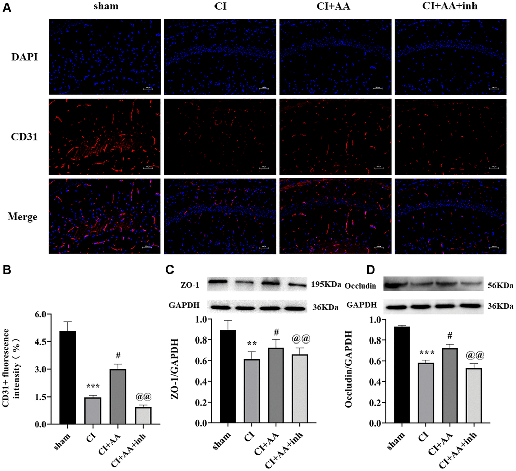 CI has seriously endangered the health of elderly individuals. The neurovascular integrity in the hippocampus is critical for learning and memory, which is susceptible to CI causes microglia-mediated inflammation and neurovascular disruption in the hippocampus, which is associated with cognitive impairment. Neurovascular impairment after CI primarily occurs in the hippocampal CA1 region and is often accompanied by cognitive impairment [20]. It is urgent to seek promising therapeutic strategies for neurovascular improvement with CI.