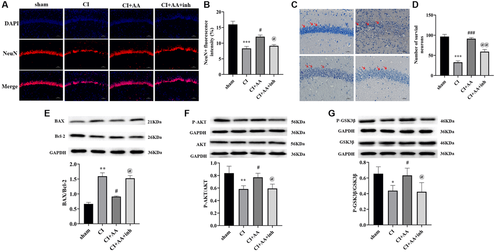 The expression of NeuN (Figure 6A) in the hippocampal CA1 region of the CI group was markedly decreased compared with that in the sham group (P < 0.001), while alisol A treatment increased the expression of NeuN (P < 0.05), and the inhibitor decreased the expression of NeuN (P < 0.05) (Figure 6B). Nissl staining was applied to detect surviving neurons in the hippocampal CA1 region (Figure 6C). In the sham group, neuronal cells were arranged densely and neatly in the hippocampus. In contrast, the neuronal cells were arranged in a disorderly manner and even disappeared in the CI group (P < 0.001). Alisol A treatment restored the destruction of neurons during CI. The number of Nissl neurons in the alisol A group was higher than that in the CI group (P < 0.001) and inhibitor group (P < 0.01) (Figure 6D). Bcl-2 plays a role in promoting survival of neurons by inhibiting the expression of BAX. The BAX/Bcl-2 ratio in the CI group was higher than that in the sham group (P < 0.01), and the ratio in the alisol A group was lower than that in the CI group (P < 0.05) and AKT inhibitor group (P < 0.05) (Figure 6E). The results suggested that alisol A may promote neuronal survival in the CA1 region of the hippocampus by downregulating the BAX/Bcl-2 ratio.