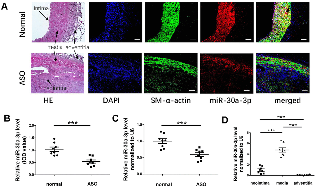 In ASO arteries with restenosis after endovascular treatment, the distribution ranges of microRNA-30a-3p and the VSMC marker SM-α-actin were basically consistent, as determined by immunofluorescence and in situ hybridization analysis (Figure 1A). According to this result, we believe that the microRNA-30a-3p was concentrated in VSMCs (Figure 1A). Then, the IOD (integrated optical density) value of these fluorescently stained sections was detected and compared. By analyzing the IOD value, we found that microRNA-30a-3p expression in ASO arteries was markedly lower than that in normal arteries (Figure 1B). Beyond that, by qRT-PCR analysis also showed that microRNA-30a-3p levels in ASO arteries were decreased (Figure 1C). Combined staining results also revealed that in ASO vessels, the microRNA-30a-3p content in neointima was markedly lower than that in the central smooth muscle layer. To further confirm this result, we separated the three layers (neointima, media, adventitia) of the ASO artery sample with forceps and then detected the relative miRNA levels. The content of micoRNA-30a-3p in the middle layer was higher than that in the other two parts (Figure 1D). Finally, in summary, microRNA-30a-3p in the ASO smooth muscle layer is significantly reduced, especially in the neointima.