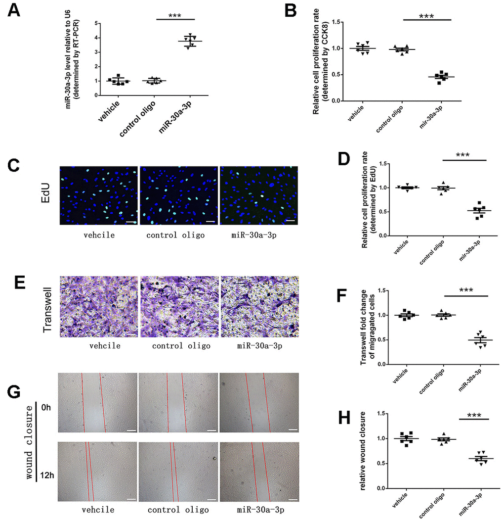MicroRNA-30a-3p mimics were first transfected into human VSMCs and then, through qRT-PCR detection, the content of microRNA-30a-3p in VMSCs was found to be markedly increased (Figure 2A). Furthermore, upregulation of microRNA-30a-3p content in VSMCs was confirmed to reduce the proliferative capacity of VSMCs by both experiments with CCK-8 (Figure 2B) and Edu (Figure 2C, 2D) assays. Next, we also found that when the microRNA-30a-3p content in cells increased, VSMC migration capacity in vitro was inhibited in two experiments, Transwell assays (Figure 2E, 2F) and wound healing analysis (Figure 2G, 2H). In summary, we can conclude from these experiments that VSMC proliferation and migration were suppressed by microRNA-30a-3p.