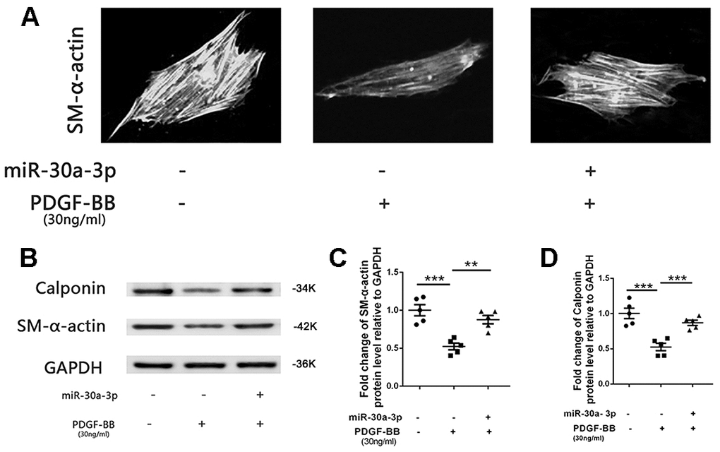The VSMCs phenotype can change from contractile to synthetic after stimulation by PDGF-BB. In this study, we examined whether this phenotypic switch of VSMCs is mediated by microRNA-30a-3p. The experiment confirmed that microRNA-30a-3p upregulation suppressed the VSMC phenotypic switch induced by PDGF-BB (Figure 3A). In general, the phenotype protein expression of SM-α-actin and calponin was decreased during PDGF-BB-stimulated VSMC switching. Further studies indicated that excess microRNA-30a-3p suppressed the VSMC phenotypic switch process, and the content of related phenotypic proteins was partially restored (Figure 3B–3D).