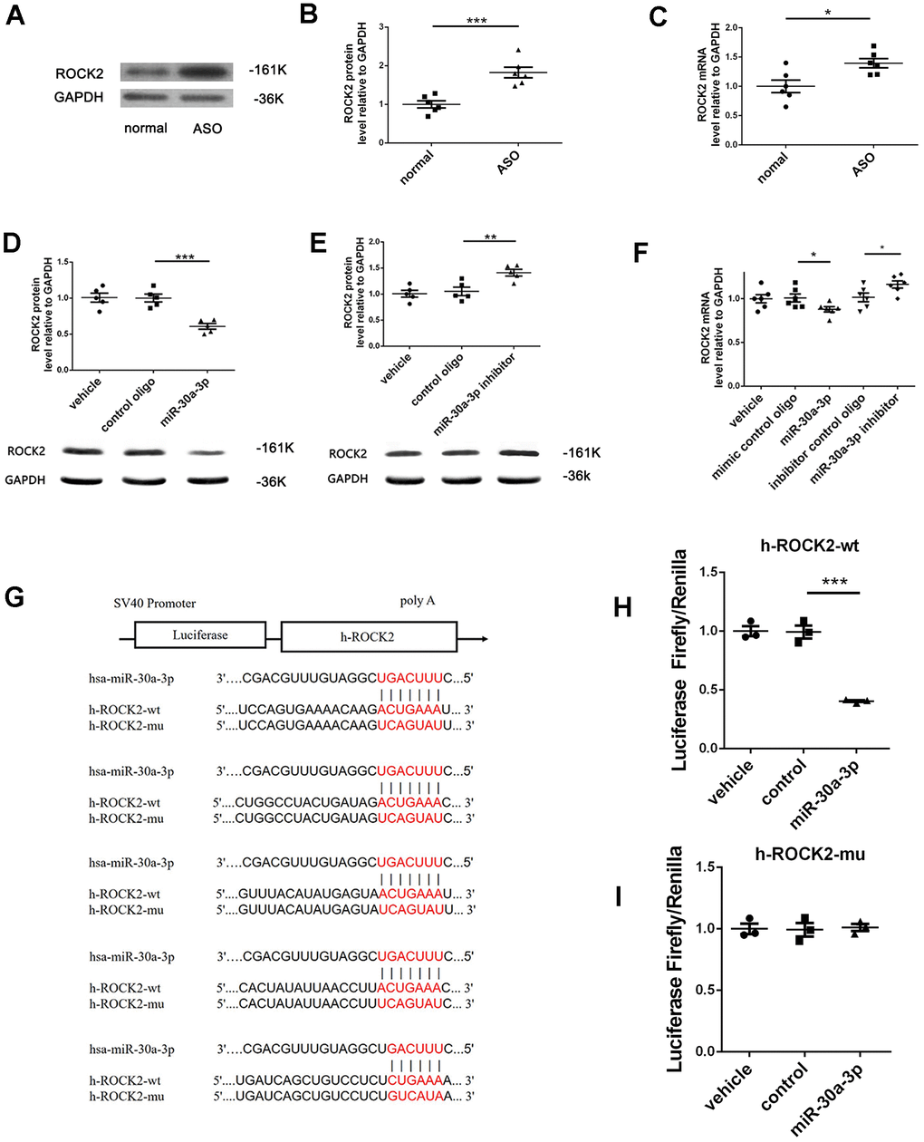 Through different databases, we found five potential microRNA-30a-3p targets in the ROCK2 3’-UTR, which are conserved in human, rat and mouse species. Thus, ROCK2 is a possible microRNA-30a-3p target gene. Then, a luciferase reporter assay indicated that microRNA-30a-3p could target the ROCK2 3’-UTR. First, we cloned the ROCK2 mRNA 3’-UTR sequence including these five possible microRNA-30a-3p target sites into an empty vector of the dual luciferase reporter (Figure 4G). As shown in Figure 4H, in the wild-type ROCK2 group, microRNA-30a-3p inhibited the relative luciferase activity, while in the mut-type ROCK2 group, the microRNA-30a-3p inhibitory effect on luciferase activity was weakened (Figure 4I). The experiment indicated that ROCK2 is indeed a microRNA-30a-3p target gene.