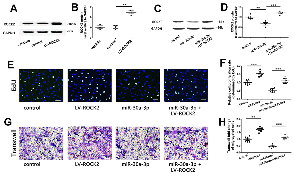 Experiments have shown that microRNA-30a-3p directly targets ROCK2. Moreover, ROCK2 protein content was decreased, and smooth muscle cell function was also inhibited by microRNA-30a-3p. Therefore, if we reincreased the protein content of ROCK2 in microRNA-30a-3p-transfected VSMCs, we should be able to rescue the microRNA-30a-3p inhibitory effects on VSMCs. Therefore, we first constructed a ROCK2 lentivirus vector containing only the CDS region of ROCK2 but not the 3’-UTR and then infected VSMCs. LV-ROCK2 increased the level of ROCK2 in VSMCs (Figure 5A, 5B), and LV-ROCK2 counteracted microRNA-30a-3p inhibition of ROCK2 (Figure 5C, 5D). In the next experiment, we found that upregulation of ROCK2 improved VSMC proliferation ability after transfection with microRNA-30a-3p (Figure 5E, 5F) and also migration ability (Figure 5G, 5H). Therefore, the effects of microRNA-30a-3p in VSMC proliferation and migration can be effectively resisted by upregulating ROCK2 expression. In summary, the above experiments show that microRNA-30a-3p directly targets ROCK2 and realizes its own functions through ROCK2.