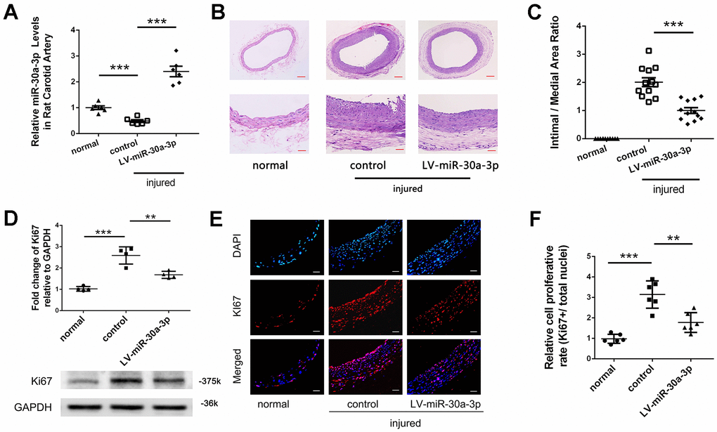 We used SD rats to construct a carotid artery injury model and used this model to explore whether microRNA-30a-3p interferes with neointimal formation. First, we upregulated microRNA-30a-3p expression in carotid artery tissue of an animal model by using a lentivirus vector. In the model, the microRNA-30a-3p level in vascular tissue was originally decreased, which is consistent with the change in human ASO arterial tissue after endovascular treatment. Then, we infected vascular tissue with a lentivirus vector (LV-miR-30a-3p) to upregulate microRNA-30a-3p expression, and the results were verified by qRT-PCR detection (Figure 6A). The following tests indicated that LV-miR-30a-3p suppressed neointima formation in the model (Figure 6B, 6C). Moreover, Ki67 protein, a marker of cell proliferation, was detected by western blotting (Figure 6D) and immunofluorescence (Figure 6E, 6F). These Ki67 changes showed that LV-miR-30a-3p suppressed the VSMC proliferation rate in the model. The above experiments proved that exogenous introduction of microRNA-30a-3p into vascular tissue can significantly reduce the formation of neointima.