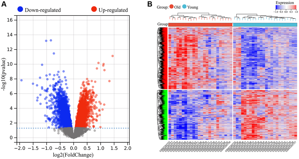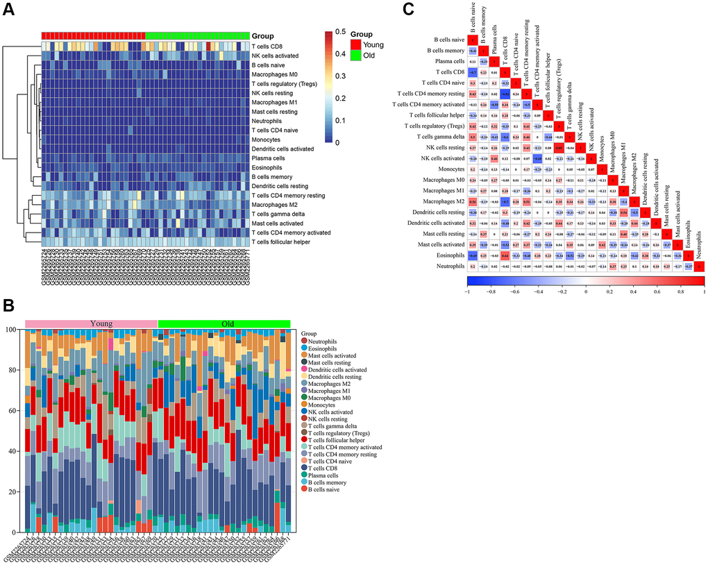 Firstly, we analyzed the infiltration of 22 immune cell types in skin tissues of the young and old groups. The bar graph and heat map showed the type and number of immune cell infiltrates in each sample (Figure 8A, 8B). Subsequently, we assessed the correlation between these immune cell populations (Figure 8C). A strong positive correlation between T cells regulatory (Tregs) and NK cells resting (r = 0.89) and a strong negative correlation between T cells CD8 and T cells CD4 memory resting (r = −0.82) were found.