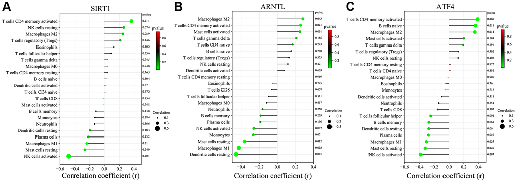 Furthermore, we further investigated the correlation of 3 key CRGs with 22 immune cell infiltration (Figure 10A–10C). SIRT1 expression showed a positive link to the infiltration status of T cells CD4 memory activated and negatively correlated with the infiltration status of Macrophages M1, Mast cells resting and NK cells activated. ARNTL expression showed a positive link to the infiltration status of Macrophages M2 and T cells CD4 memory activated and negatively correlated with Mast cells resting, Macrophages M1 and Dendritic cells resting. Moreover, ATF4 expression was positively linked to the infiltration status of T cells CD4 memory activated, B cells naive and Macrophages M2 and negative correlation with the infiltration status of Macrophages M1, Mast cells resting and NK cells activated.