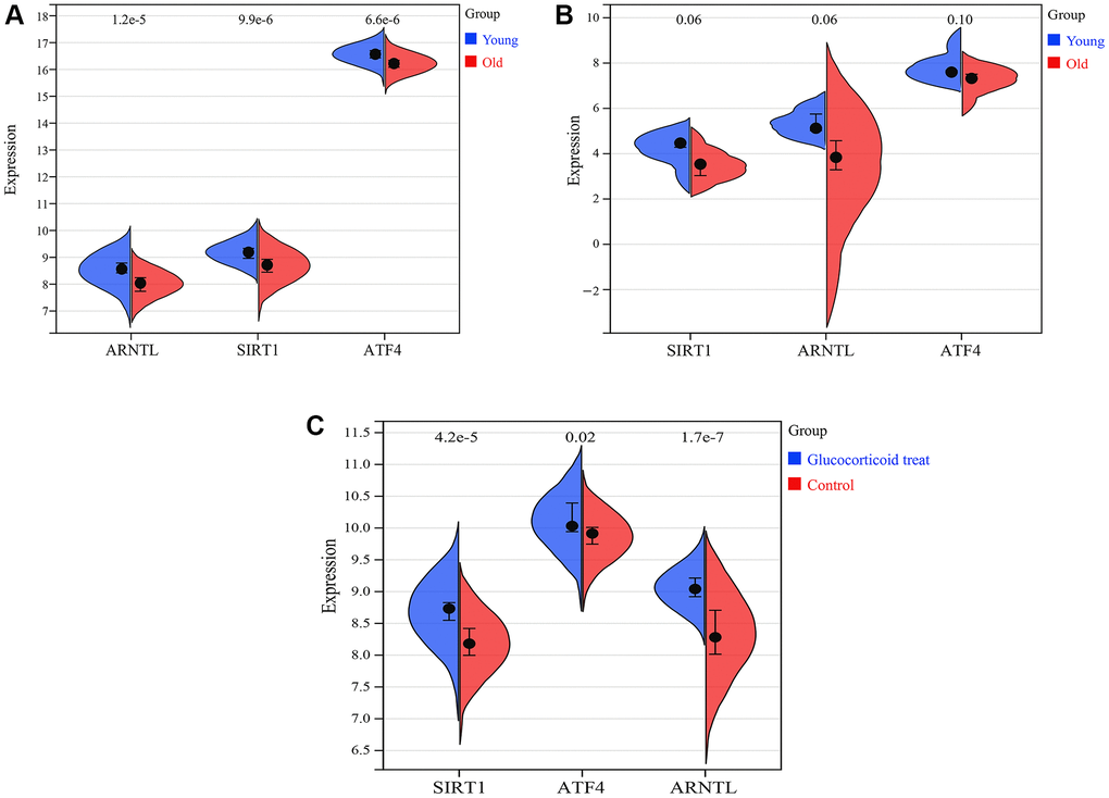 We further investigated the expression profiles of SIRT1, ARNTL and ATF4 in skin aging. The results showed that in the training set GSE85358, the expression of SIRT1, ARNTL and ATF4 mRNAs were significantly downregulated in the skin tissue of the old group compared to the young group (Figure 11A). Similarly, in the validation set GSE39170, the expression of SIRT1, ARNTL and ATF4 mRNAs were down-regulated in the skin tissues of the old group compared to the young group. Glucocorticoids are the most commonly used drugs for anti-skin aging in clinical practice (Figure 11B). In the validation set GSE120783, glucocorticoid treatment was used to mimic anti-skin aging. In GSE120783, the expression of SIRT1, ARNTL and ATF4 mRNA was significantly up-regulated in the glucocorticoid treated group compared to the control group (Figure 11C).