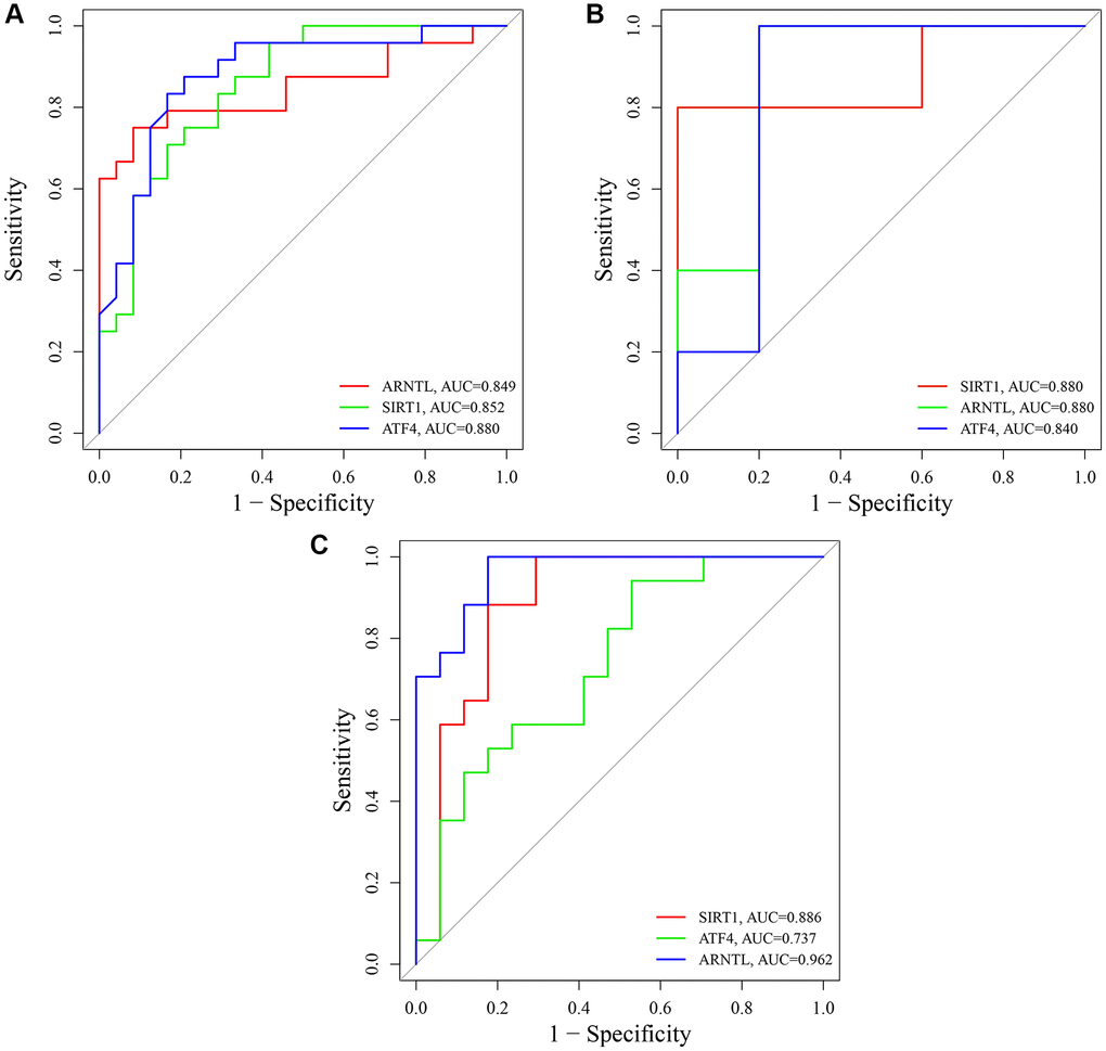 To evaluate the diagnostic specificity and sensitivity of key CRGs, we constructed ROC curves and calculated the AUC for each item. In the training set GSE85358, the AUC values of SIRT1, ARNTL, and ATF4 were 0.852, 0.849, and 0.880, respectively (Figure 12A). In the validation set GSE39170, the AUC values of SIRT1, ARNTL, and ATF4 were 0.880, 0.880, and 0.840, respectively (Figure 12B). Moreover, in the validation set GSE120783, the AUC values of SIRT1, ARNTL, and ATF4 were 0.886, 0.962, and 0.737, respectively (Figure 12C). These results indicate that the expression of SIRT1, ARNTL, and ATF4 genes could effectively distinguish aging skin from young skin.