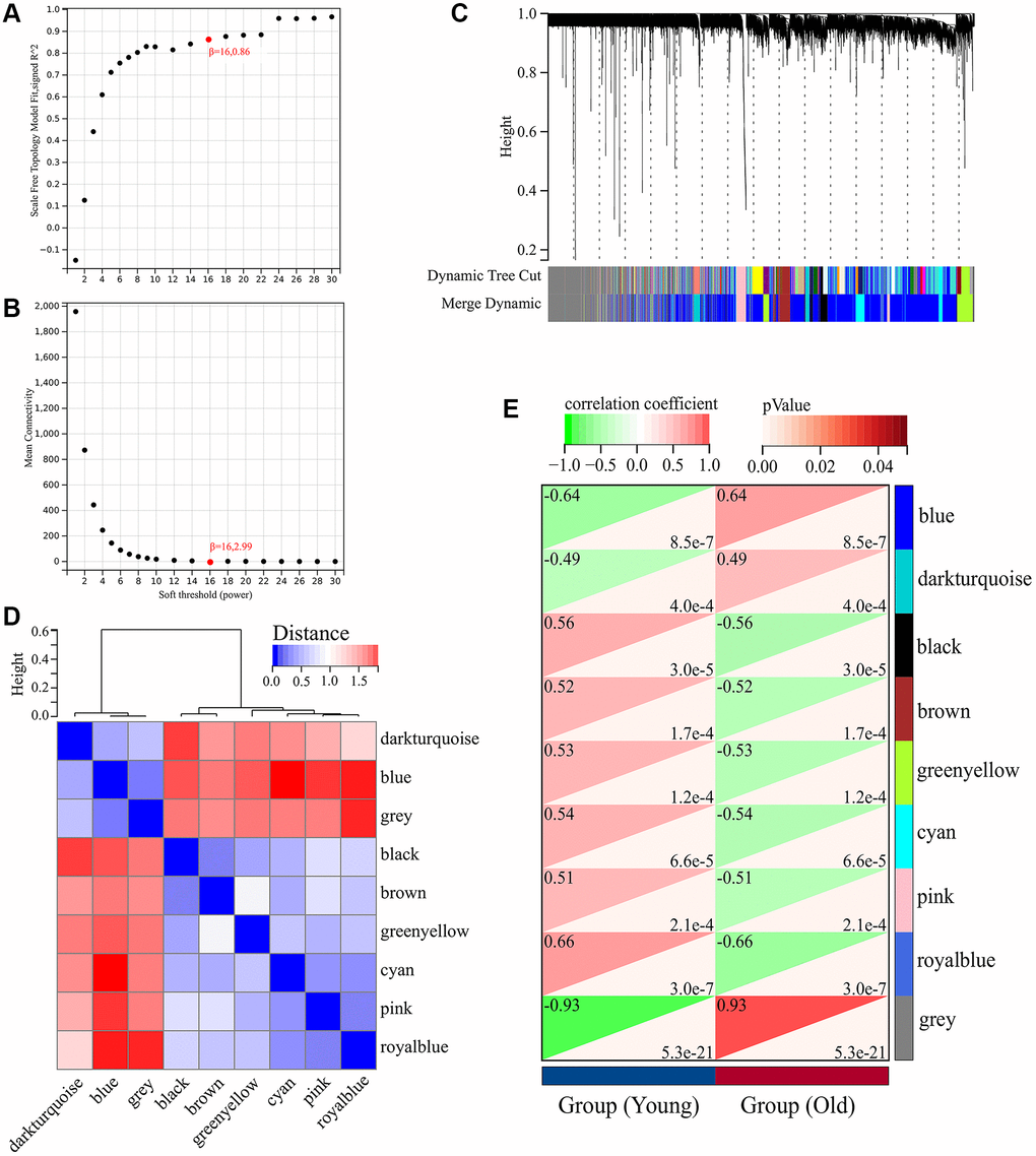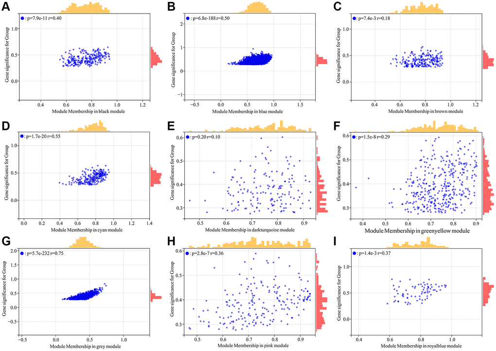 A total of 5726 DEGs were screened from skin tissues of old and young groups in GSE85358, including 3169 upregulated and 2457 down-regulated in the old group (Figure 1A). The expression heat map of DEGs was shown in Figure 1B. The expression matrix of DEGs was used for WGCNA analysis. The WGCNA results were shown in Figures 2 and 3. The optimal soft threshold β was set to 16 (Figure 2A, 2B). Based on the DynamicTreeCut algorithm, with a minimum module size of 30, deep split of 3, and a maximum module distance of 0.25, 9 gene modules were generated, including black, blue, brown, cyan, darkturquoise, greenyellow, grey, pink and royalblue (Figure 2C). We analyzed the connectivity of module eigengenes (MEs), and the results indicated that the distance between the modules was greater than 0.25, indicating that the modules and genes in each module were independent (Figure 2D). The correlation coefficients between these modules and the clinical feature (Skin aging) were calculated. The results showed that all modules were significantly associated with skin aging (Figure 2E). Moreover, according to the criteria of |GS| >0.5 and |MM| >0.5 and p value < 0.05, a total of 1162 hub genes highly associated with skin aging were identified from 9 significant modules (Figure 3A–3I).