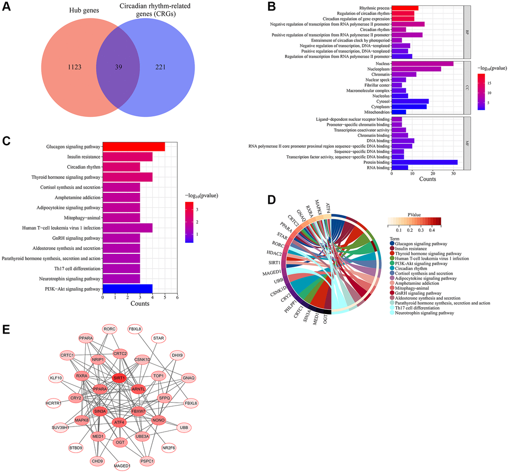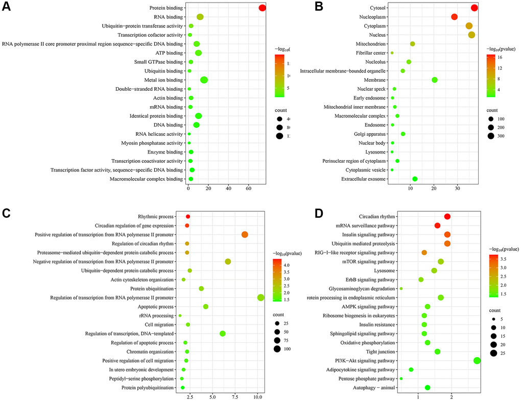 To initially explore the potential molecular mechanisms of skin aging, GO and KEGG functional enrichment analysis of hub genes was performed. The top 20 most significantly enriched terms were displayed in Figure 4. GO analysis suggested that these hub genes exerted multiple functions such as protein binding, RNA binding, ubiquitin-protein transferase activity, transcription cofactor activity, RNA polymerase II core promoter proximal region sequence-specific DNA binding (Figure 4A). The hub genes were mainly enriched in many CCs such as cytosol, nucleoplasm, cytoplasm, nucleus, mitochondrion (Figure 4B). And they were involved in several BPs such as rhythmic process, circadian regulation of gene expression, positive regulation of transcription from RNA polymerase II promoter, regulation of circadian rhythm, proteasome-mediated ubiquitin-dependent protein catabolic process (Figure 4C). KEGG enrichment analysis findings revealed that these hub genes were primarily enriched by signaling pathways including circadian rhythm, mRNA surveillance pathway, insulin signaling pathway, ubiquitin mediated proteolysis, RIG-I-like receptor signaling pathway (Figure 4D). Notably, hub genes were significantly enriched to biological functions and signaling pathways associated with circadian rhythms, suggesting that circadian rhythms may play an important role in the skin aging process.