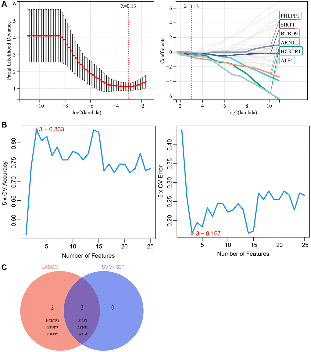 Two machine learning algorithms were used in our study to further screen the key genes from 39 skin aging-related CRGs, which may become potential biomarkers or therapeutic targets for skin aging. Firstly, a LASSO regression model was designed based on samples from aged and young skin tissues. When λ= 0.13, the LASSO regression model was able to accurately evaluate both old and young skin tissues. Therefore, LASSO analysis yielded 6 candidate genes (Figure 7A). Moreover, SVM-REF analysis was performed and identified 3 candidate genes (Figure 7B). Finally, the results from the two algorithms were combined, yielding 3 key CRGs that are associated with skin aging, including SIRT1, ARNTL, ATF4 (Figure 7C).