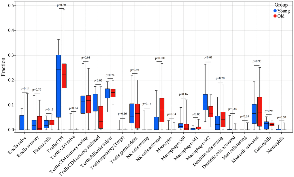 In addition, we compared the infiltration levels of 22 types of immune cells in skin tissues between the young and old groups. Immune cells such as NK cells activated, Macrophages M1 and Mast cells resting had a significantly higher expression in skin tissue in the old group, whereas T cells CD4 memory activated and Macrophages M2 showed a significantly lower expression in skin tissue in the old group (Figure 9).