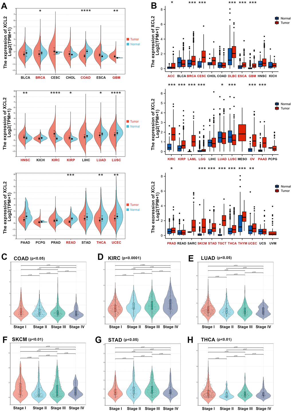 Additionally, we used the SangerBox platform to determine whether there was a correlation between XCL2 expression and the pathological stages of various cancers. A significant correlation between different pathological stages and XCL2 expression levels was found in COAD, KIRC, LUAD, SKCM, STAD, and THCA (Figure 1C–1H). Additionally, we found that in many cancers, with an increase in pathological stage, XCL2 expression decreased.