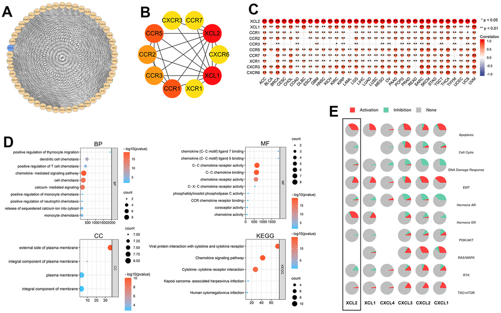 To further explore the biological function of XCL2, the STRING database was used to identify the 50 genes most closely associated with XCL2 and a PPI network was built using Cytoscape (Figure 11A). Using the MCC cytoHubba ranking, we derived the 10 most relevant genes in the PPI network: XCL1, CCR1, CCR5, CCR2, CCR3, XCR1, CXCR6, CXCR3, and CCR7 (Figure 11B). The top 10 genes closely related to 33 cancers were mainly chemokines and played similar roles in vivo, as shown in Figure 11C. We then performed a GO/KEGG enrichment analysis using these genes (Figure 11D). The biological process (BP) enriched in this dataset was most relevant to the positive regulation of thymocyte migration, dendritic cell chemotaxis, and the positive regulation of T cell chemotaxis. In contrast, cellular components (CC) were associated with some biological functions of the plasma membrane, including the external side of the plasma membrane and an integral component of the plasma membrane. The top GO terms of molecular function (MF) were chemokine ligand 7/5 binding and C-C chemokine receptor activity. The top three KEGG pathways were viral protein interaction with cytokine and cytokine receptors, chemokine signaling pathways, and cytokine-cytokine receptor interactions. Overexpression of XCL2 can significantly activate apoptosis, EMT, Hormone ER, and TSC/mTOR signaling pathways and inhibit the cell cycle, PI3K/AKT, and RTK pathways (Figure 11E).