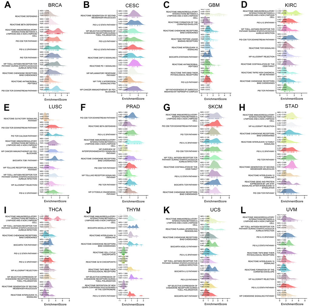 We also performed Gene Set Enrichment Analyses (GSEA) on 12 cancers with differential prognoses (Figure 12A–12L). The results of 12 cancers showed that XCL2 is primarily associated with the biological function of T lymphocytes, including T cell polarization, PD-1 blockade, differentiation, chemotaxis, and multiple pathways of T cell-associated inflammatory factors such as IL12, IL23, STAT4, CD8, and TCR pathways. These results suggested that XCL2 is closely related to the processes of multiple lymphocytes, especially T lymphocytes and NK cells, in various cancers.