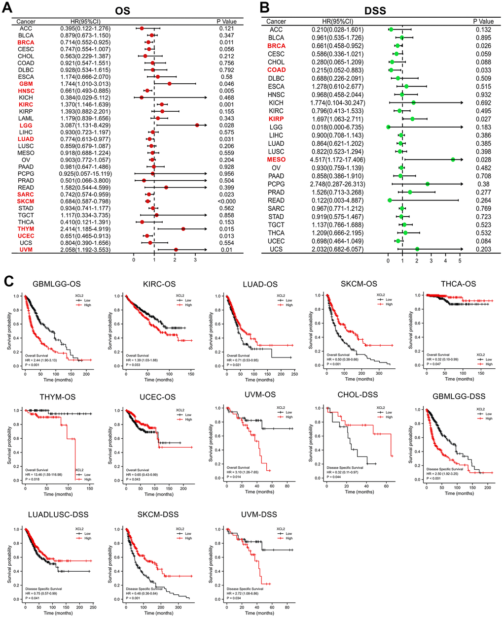 Furthermore, we analyzed the prognostic effect of XCL2 in 33 cancer types using univariate Cox regression analyses and Kaplan–Meier survival curves. Univariate Cox regression analysis of OS (Figure 2A) revealed that high XCL2 levels were significant risk factors for BRCA (P = 0.011), GBM (P = 0.046), HNSC (P = 0.005), KIRC (P = 0.001), LGG (P = 0.028), LUAD (P = 0.031), SARC (P = 0.023), SKCM (P < 0.001), THYM (P = 0.015), UCEC (P = 0.013), and UVM (P = 0.01). As for DFS (Figure 2B), the univariate analysis showed that high expression of XCL2 was strongly correlated with poor DSS in BRCA (P = 0.026), COAD (P = 0.033), KIRP (P = 0.027), and MESO (P = 0.028).