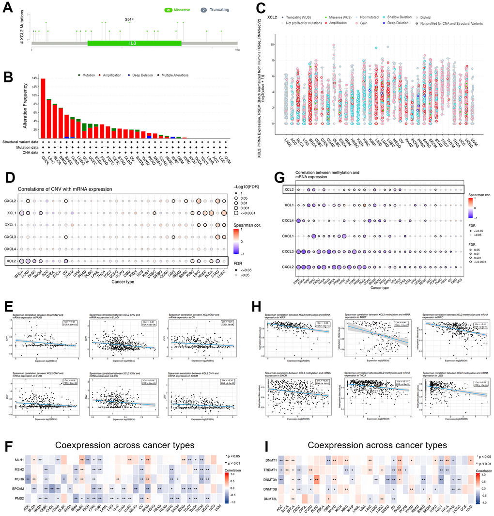 In this study, we searched the cBioPortal database [17] (https://www.cbioportal.org/) for XCL2 genetic alteration information using the “Cancer Types Summary,” “Mutations,” and “Plots” modules, including the mutation sites, mutation types, and mutation counts. Additionally, we used Gene Set Cancer Analysis [18] (GSCA) (http://bioinfo.life.hust.edu.cn/web/GSCALite/), an online gene set cancer analysis platform, to explore the association between XCL2 expression and gene copy number variation (CNV) and degree of DNA methylation. We also entered four genes closely related to XCL2 function on GSCA website: XCL1, CXCL1, CXCL2, CXCL3, and CXCL4. Finally, we used Spearman’s correlation analysis to evaluate the relationship between XCL2 expression and five methyltransferases (DNMT1, TRDMT1, DNMT3A, DNMT3B, and DNMT3L) and five MMR-related genes (MLH1, MSH2, MSH6, EPCAM, and PMS2) in 33 types of cancers based on gene expression in the TCGA database. Statistical significance was set at P < 0.05.