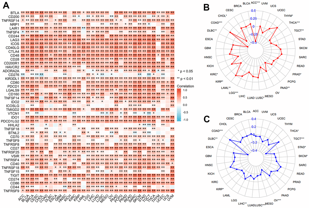 According to the World Health Organization (WHO) report from 2019 [1], cancer has become the primary or second leading cause of disease in 112 of 183 countries with the highest number of deaths before age 70, ranking third or fourth in the other 23 countries. It also showed a new peak in incidence and mortality compared to 2018 [2]. Over the past few years, the advent of immunotherapy has offered new ideas for treating cancer progression and metastasis. Therefore, the importance of the tumor microenvironment is currently the most studied and difficult aspect of cancer research [3]. The identification of novel immune checkpoints such as PD-1, PD-L1, CTLA-4, TIM3, and others by inciting or suppressing cytotoxic CD8+ T lymphocytes, regulatory T cells, NK cells, and others has provided new ideas for the treatment of malignant tumors [4–6]. Single-agent immune checkpoint inhibitor (ICI) therapy produces long-term responses in patients with advanced cancer [7]. However, only a small proportion of patients benefit, and recurrence is common owing to multiple resistance mechanisms [8]. The molecular mechanism of cancer cell death by activating numerous immune cells remains unclear. Identifying novel immunotherapeutic targets and biomarkers for cancer is vital for increasing cancer survival rates.