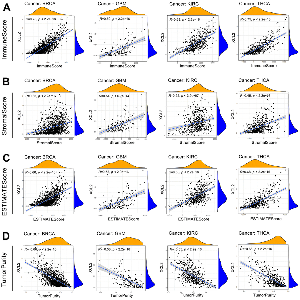 The presence of immune cells in the immune microenvironment can be a potential target for immunotherapy, and XCL2 is a chemokine that recruits many immune cells [16]. Therefore, we investigated the relationship between XCL2 expression and the degree of immune cell infiltration to examine the role of XCL2 in tumor immunity. We calculated the stromal, immune, and ESTIMATE scores and tumor purity of 33 cancers using Spearman’s correlation analysis and found that immune scores were positively associated with XCL2 expression, especially in BRCA, GBM, KIRC, and THCA (Figure 5A–5D).