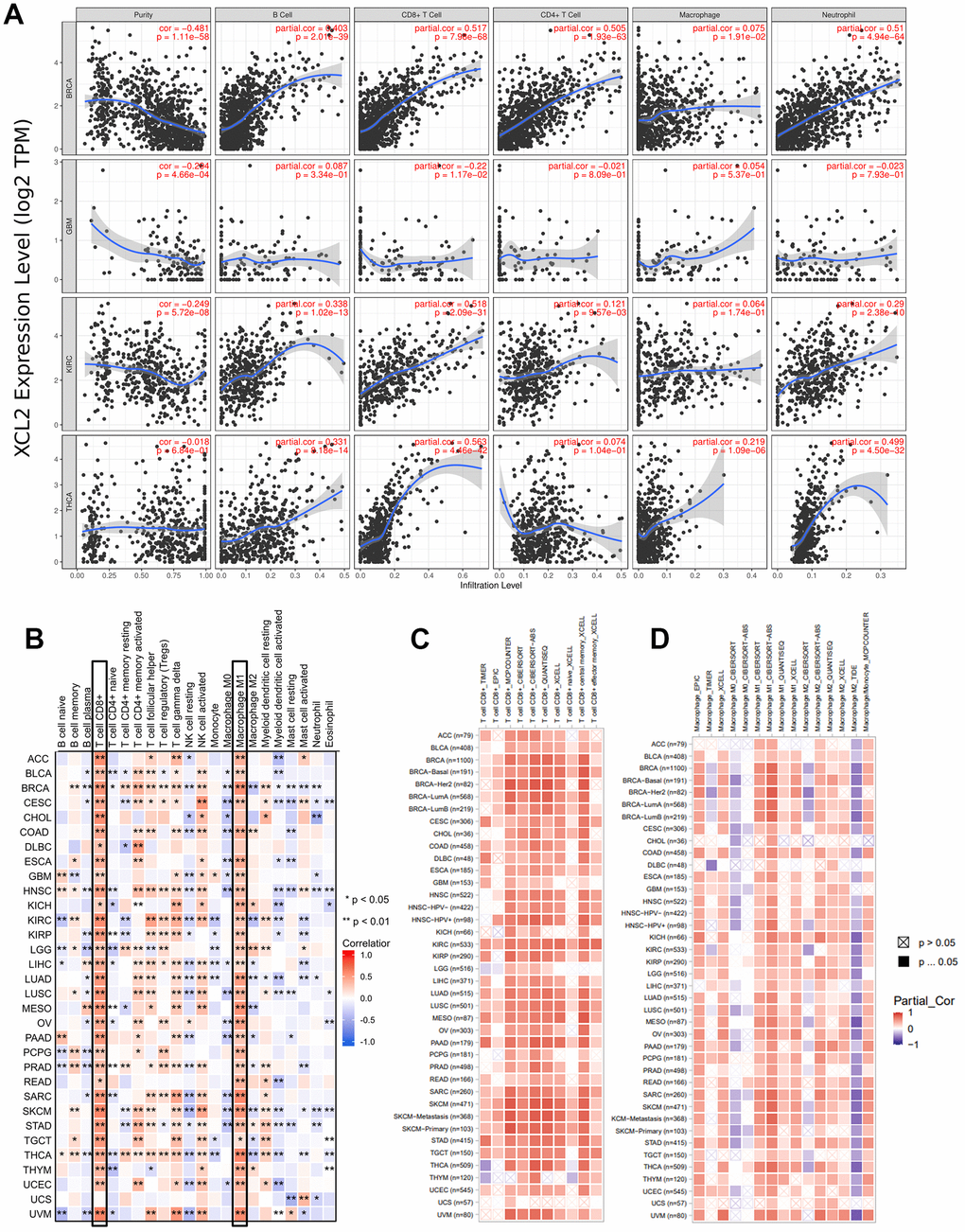 Using TIMER2.0, we also found that XCL2 expression was positively or negatively correlated with B, CD4+ T, CD8+ T, and neutrophils in BRCA, GBM, KIRC, and THCA, but the correlation was weakest in macrophages (Figure 6A). Subsequently, we independently extracted the immune cell infiltration of the tumor microenvironment calculated by the CIBERSORGT algorithm. We demonstrated that high expression of XCL2 correlated strongly and positively with M1 macrophages and CD8 T cells in pan-cancer, whereas other cells (e.g., macrophage type M0, macrophage type M2, and CD4 T cells) showed inconsistent correlations (Figure 6B). We then calculated the correlation between the expression of CD8 + T cells, macrophages, and XCL2 in 33 cancers. We found a positive correlation between XCL2 expression and CD8 + T cells and macrophages (especially M1 macrophages) in pan-cancer (Figure 6C, 6D). This is consistent with our finding that XCL2 expression levels positively correlate with the infiltration of M1 macrophages and T lymphocytes.