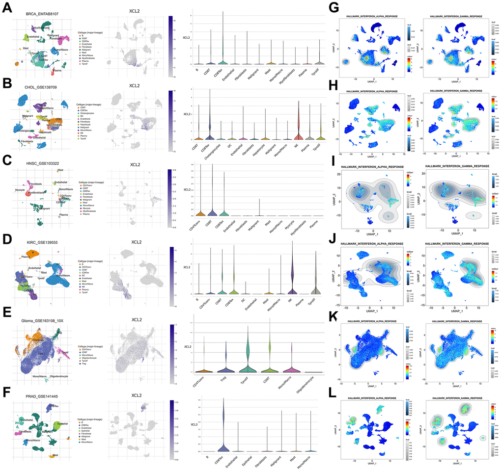 We used scRNA-seq to delineate the expression levels of XCL2 and its immune infiltrative role in BRCA, CHOL, HNSC, LAML, KIRC, KICH, GBM, OV, LIHC, PRAD, and THCA. Different cell surface markers distinguished different clusters of infiltrating immune cell types (e.g., monocytes, B cells, CD8T cells, CD8Tex, and NK cells) in each tumor sample. The expression of XCL2 in different cell clusters in each tumor sample is displayed in Figure 7 and Supplementary Figure 2. The trend of XCL2 expression in cell clusters was nearly identical in all tumor samples. For example, XCL2 is widely distributed in cancer and various immune cells. However, we identified abundant expression in all types of CD8+ T cells in the cancers mentioned above, whereas NK cells showed high XCL2 expression in CHOL and KIRC (Figure 7 and Supplementary Figure 2). Notably, XCL2 was also highly expressed in macrophages from BRCA, GBM, PRAD, and KIRC (Figure 7A, 7G, 7I, 7K). Additionally, we found that interferon-alpha and interferon-gamma responses were primarily enriched in CD8+ T cells and macrophages in almost all cancers by exploring single-cell characteristics (Figure 7 and Supplementary Figure 2).