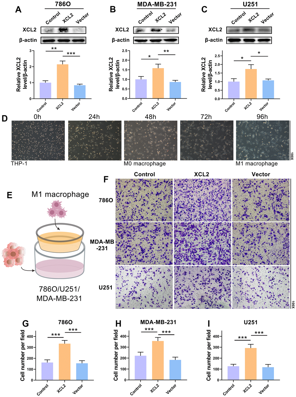 The human KIRC cell line 786O, GBM cell line U251, and BRCA cell line MDA-MB-231 were transfected with a lentivirus. According to the western blotting findings, XCL2 significantly increased the protein level of XCL2 compared to the vector (Figure 9A–9C). The ability of M1 macrophages to migrate was further examined to determine whether XCL2 suppression had any effect on 786O, MDA-MB-231, and U251 cells. Human THP-1 cells were induced to differentiate into M1 macrophages (Figure 9D). We then co-cultured M1 macrophages with 786O, MDA-MB-231, and U251 cells using a transwell apparatus (Figure 9E). Similarly, overexpression of XCL2 in 786O, MDA-MB-231, and U251 cells enhanced the ability of M1 macrophages to migrate when co-cultured (Figure 9F–9I). Our results showed that XCL2 may mediate M1 macrophage migration.