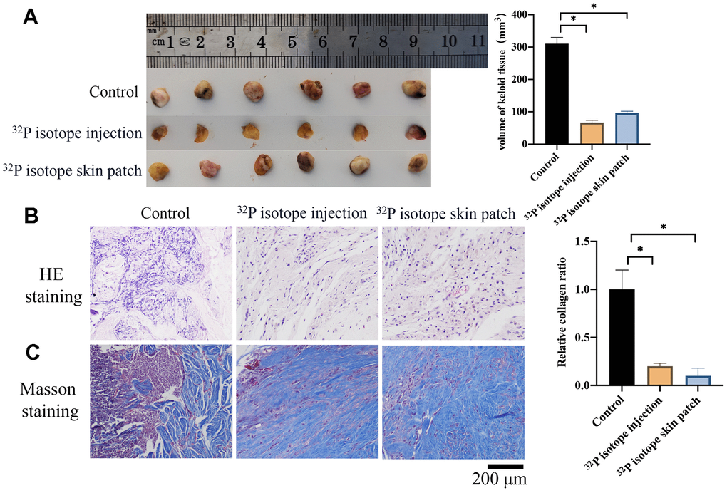 Eighteen healthy male BALB/c nude mice (Charles River, Beijing, China), aged 4–6 weeks, were selected for the experiment. Anesthesia was administered, and an 8-mm incision was made in the scapular area of each nude mouse. Keloid tissues, obtained during surgery, were cut into blocks approximately 4 mm3 in size and implanted in the subcutaneous space of the nude mice. The skin was then sutured to secure the implants. After 21 days, the mice were randomly divided into three groups: control, 32P isotope injection, and 32P isotope skin patch. The mice in the group 32P isotope skin patch were treated using the customized 32P isotope therapy patch from China Atomic Energy Research Institute, with an effective treatment area of 1.0 cm × 1.0 cm, with a radiation dose of 1.08 cGy/s·cm2. 6 layers of tin foil were used to protect the non-irradiated skin, and 32P isotope therapy was applied to the surface of the skin for 150 s each time. The treatment frequency is once every 2 days, with a total of 10 treatments. The gross morphology and histopathology of keloids were observed after 21 days of continuous injection. The dosage of 32P isotope was determined based on our pre-experiment and previous report [9].