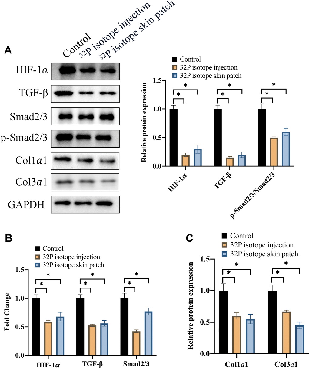 Both 32P isotope injection and skin path significantly inhibited TGF-β/Smad signaling pathway