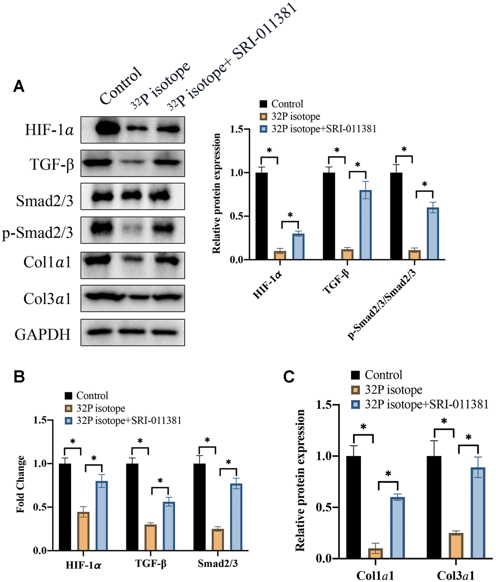 In addition, the influence of 32P isotope treatment and SRI-011381 on the protein and mRNA expression of HIF-1α, TGF-β/Smad2/3, Coll1α1, and Coll3α1 were also measured. We demonstrated that the inhibitions of HIF-1α, TGF-β, p-Smad2/3/Smad2/3 by 32P isotope were greatly reversed after SRI-011381 treatment (Figure 4A–4C).