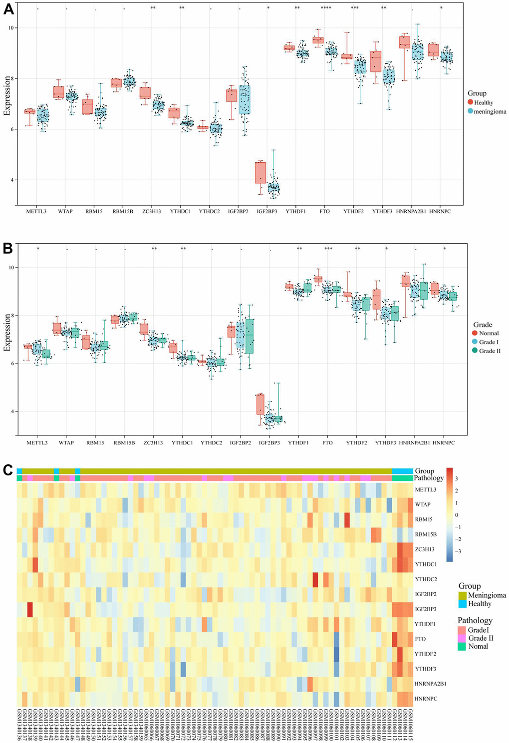 The expression level of m6A RNA methylation regulator in meningioma and normal tissues