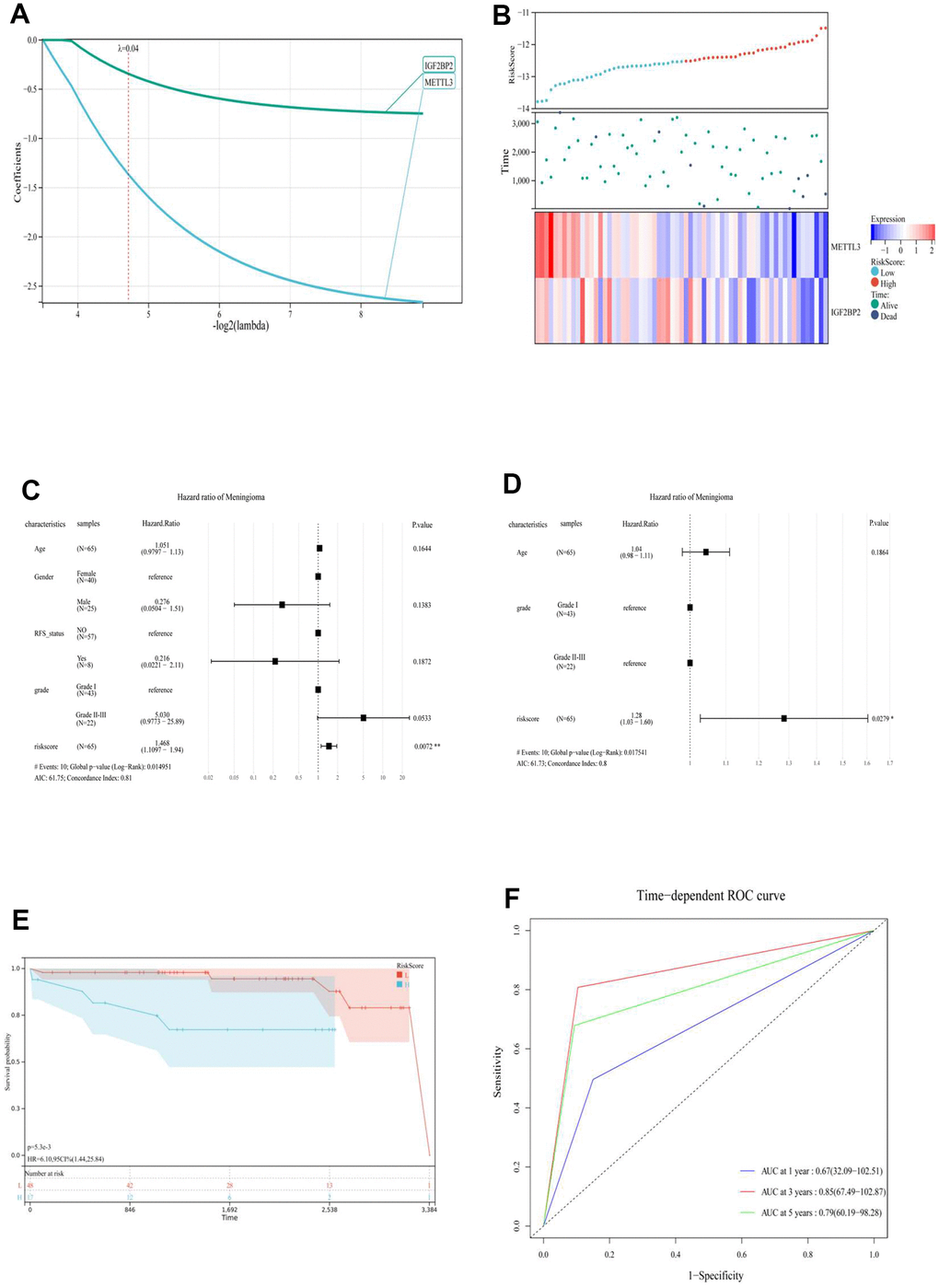Second, a risk-scoring system based on the level of gene expression and risk coefficient was constructed to comprehensively explore the relationship between the expression level of the m6A regulator and prognosis of meningioma. To avoid overfitting the model construction, LASSO regression was used, and a risk model for the two prognostic genes was constructed based on partial likelihood deviation, lambda value (lambda = 0.04) (Figure 2A, 2B), and RiskScore = (–0.34 * IGF2BP2) + (–1.36 * METTL3). Moreover, the “cutoff” package was used to identify the best cutoff value to group the prognostic models (high-risk and low-risk groups). Overall, univariate (C-index: 0.81) and multivariate Cox (C-index: 0.8) regression analyses further confirmed that the RiskScore was an independent prognostic factor for the prognosis of meningioma (Figure 2C, 2D). The high-risk group had a shorter survival time than the low-risk group (p < 5.3e-3) (Figure 3E). The receiver operating characteristic (ROC) curve was used to evaluate the prognostic model and prediction accuracy of the two m6A genes (Figure 2F). The prognostic RiskScore models showed 1-, 3-, and 5-year area under the ROC curve (AUC; 0.67, 0.85, and 0.79, respectively). RiskScore proved to be an independent prognostic factor of meningiomas with good sensitivity and specificity.