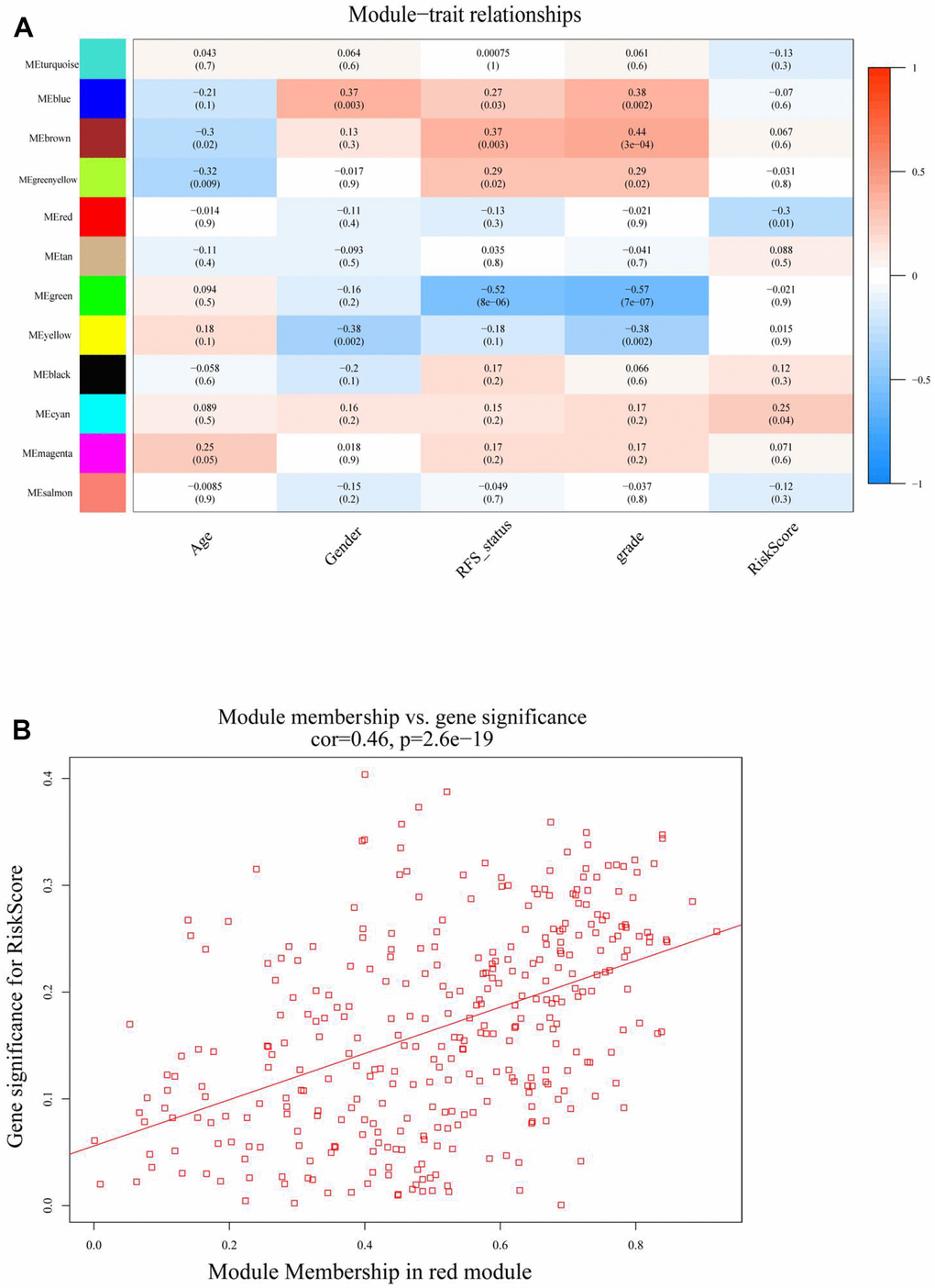 The results revealed that RiskScore was an independent prognostic factor for meningiomas. The gene regulation of methylation in meningiomas was clarified by a designed gene regulatory network associated with the RiskScore; this was also used to establish separate groups (high- and low-risk groups) through the “cutoff” package, and WGCNA was performed. The soft threshold power was set to four (R2 = 0.89) and modules were merged (threshold value = 0.2) to obtain 12 modules (Figure 3A–3D). The network heatmap indicated close relation between the modules (Figure 3D), and the eigengene adjacency heatmap showed that the modules were independent of each other (Figure 3E). The module-trait relationships heatmap (Figure 4A) helped in determining that the RiskScore was negatively correlated with the red module (COR = –0.3, p = 0.01).