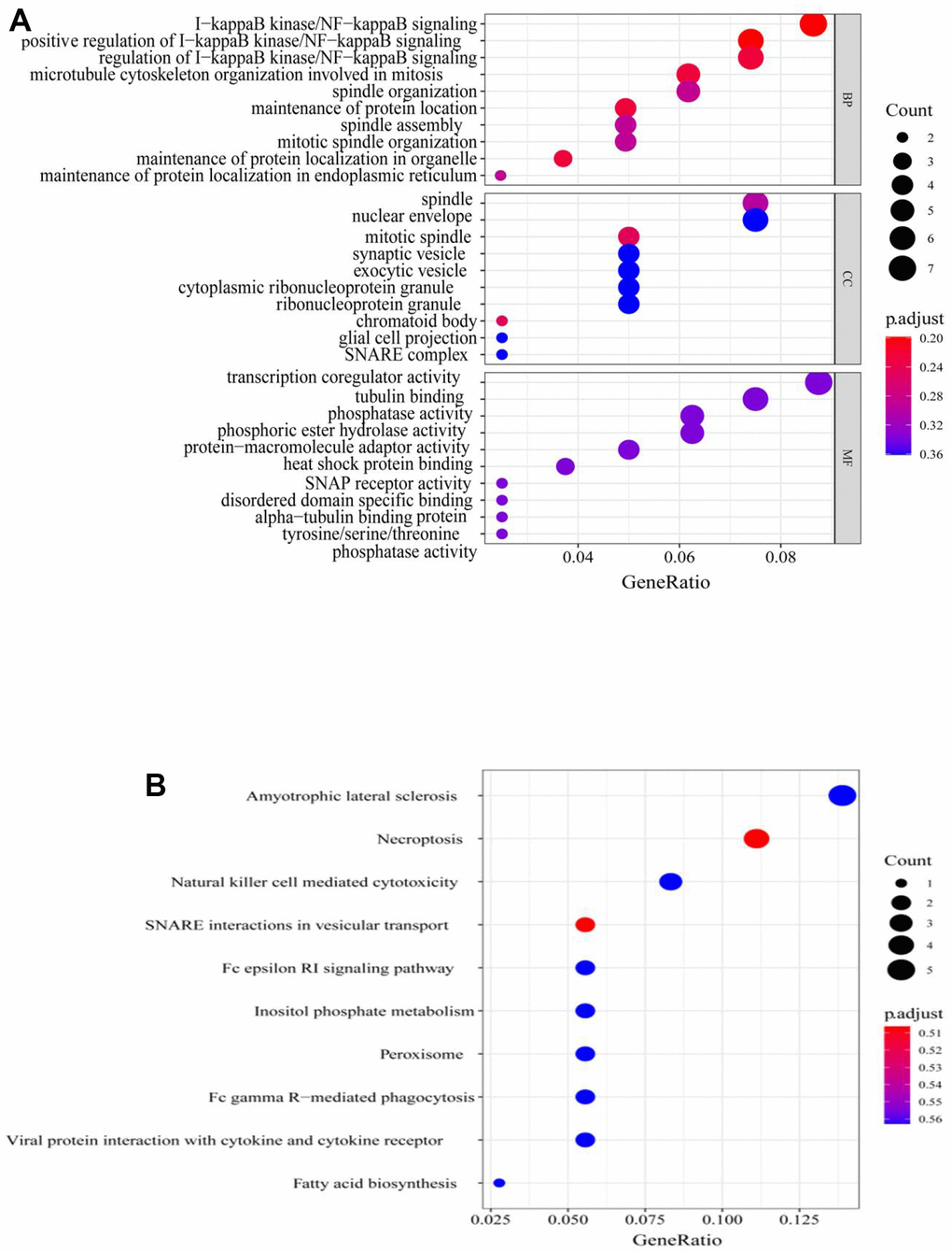 To further understand the features of the characteristic genes in the red module, the correlation between module membership and significance of the gene was first analyzed (COR = 0.46, p = 2.6e-19) (Figure 4B and Supplementary Table 2); this accelerated the understanding of the regulatory mechanism of m6A methylation. Next, Gene Ontology (GO) function and Kyoto Encyclopedia of Genes and Genomes (KEGG) pathway analyses were performed for all genes in the red module (Figure 5A, 5B). The red module GO (Biological Progress) analysis mainly comprised I-kappaB kinase/NF-kappaB signaling, and KEGG pathway analysis comprised necroptosis and natural killer cell-mediated cytotoxicity. The RiskScore regulatory network was identified, and the disease gene characteristics and potential biological mediation pathways of RiskScore as independent prognostic factors were preliminarily described.