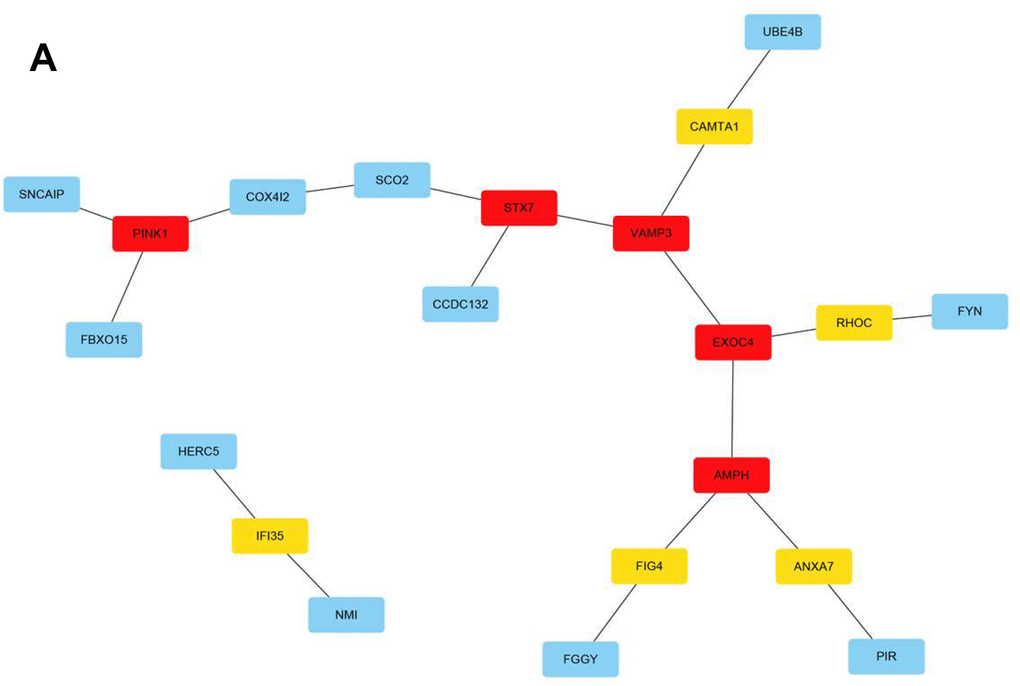 The Search Tool for the Retrieval of Interacting Genes/Proteins (STRING; https://cn.string-db.org/) database serves as an online platform that evaluates and integrates protein-protein interactions and transmits mutual information between organisms [10]. Here, all genes in the red module (n = 100) were analyzed. Moreover, Cytoscape software was used for network visualization and processing (Figure 6A). The m6A RNA methylation regulatory network landscape in meningiomas was also described. In other words, the mechanism of meningiomas could involve a gene network regulated by m6A RNA methylation and occur due to changes in the abovementioned genes. The results of this study lay a foundation for future research on the genetic landscape of meningiomas.