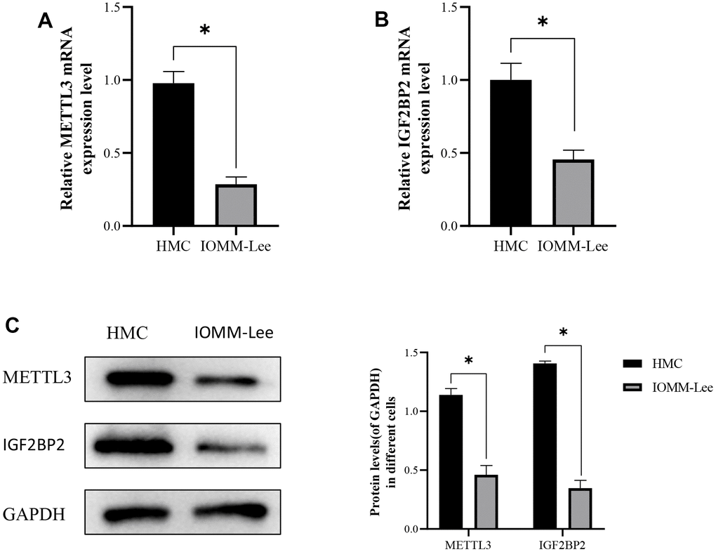 To verify whether m6A methylated hub regulators (METTL3 and IGF2BP2) played an important role in meningioma, their mRNA expression levels in normal meningeal cells (HMC) and meningioma cells (IOMM-Lee cells) were first detected by reverse transcription polymerase chain reaction (Figure 7A, 7B). The results showed that the expression levels of METTL3 and IGF2BP2 in IOMM-Lee cells were lower than those in HMC. In addition, low expression of METTL3 and IGF2BP2 in meningioma cells was verified by western blotting (Figure 7A).