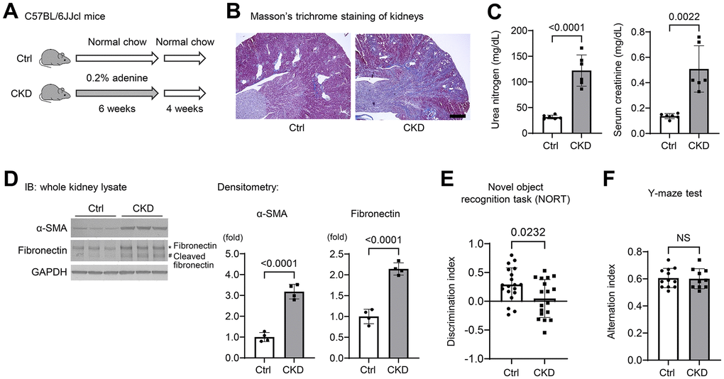 To investigate the molecular mechanisms of cognitive decline in CKD, we established a CKD model in mice by adenine-induced tubulointerstitial fibrosis [19] (Figure 1A), and examined whether this model could influence the short-term memory of mice. Masson’s trichrome staining of CKD mouse kidneys indicated diffuse tubular dilatation and increased fibrotic areas (Figure 1B). Serum uremic solutes, urea nitrogen, and creatinine were also elevated in CKD mice (Figure 1C). The protein expression levels of α-smooth muscle actin (α-SMA), fibronectin, and cleaved fibronectin were elevated in kidney preparations from CKD mice (Figure 1D).