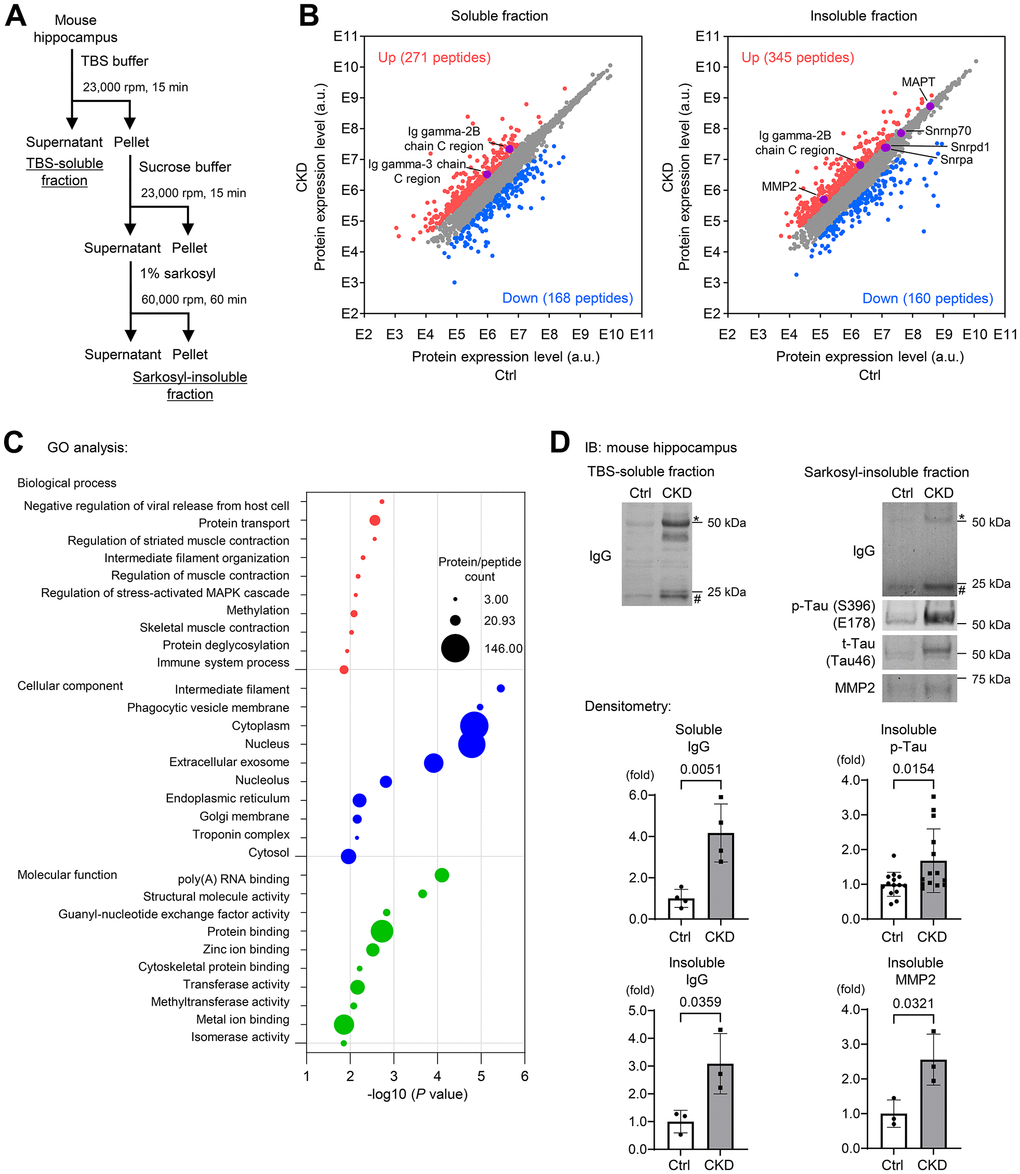 To determine a brain proteomic signature in CKD mice, we performed proteomic analyses of hippocampus tissue lysates from TBS-soluble and detergent-insoluble aggregated protein fractions [11–13] (Figure 2A), because neurodegenerative diseases currently encompass a broad range of disorders characterized by the deposition of insoluble protein aggregates, which contribute to disease progression [11]. We performed mass spectrometric analysis of mouse hippocampal tissue lysates prepared from TBS-soluble fraction as well as sarkosyl-insoluble fraction from three CKD and three control specimens [22]. We identified over 7,000 unique protein fragments or peptides that were differentially expressed ≥3.0 fold between CKD and control samples, and the differentially expressed genes (DEGs) are depicted in Figure 2B. Gene ontology (GO) enrichment analysis for all DEGs in the insoluble fraction revealed several pathways of interest, including “biological processes” (e.g., protein transport and intermediate filament organization), “cellular components” that were predominantly composed by organelles, and “molecular functions,” particularly poly(A) RNA-binding and protein binding (Figure 2C).