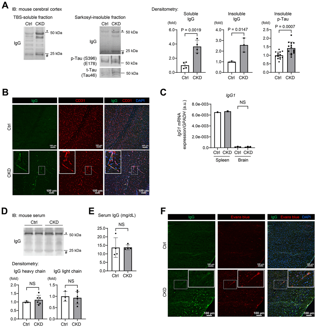 We therefore examined whether IgG elevation in CKD brain tissue originated from white blood cells (WBCs) localized in the brain or serum circulating IgG. Quantitative reverse transcription-PCR indicated that production of IgG1 mRNA in brain tissue was negligibly low and not statistically different between the CKD and control groups (Figure 3C). Western blotting of serum from CKD and control groups showed no significant differences in IgG concentrations (Figure 3D). In addition, measurements of serum IgG by turbidimetric immunoassay did not show differences between the groups (Figure 3E).