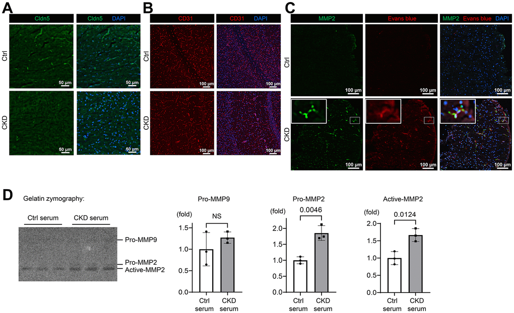 To elucidate whether uremic serum in circulation could upregulate MMP2 activity in brain endothelial cells, we performed gelatin zymography, using the murine brain endothelial cell line bEnd.3 treated with serum derived from CKD model mice. As shown in Figure 4D, uremic serum activated MMP2 as opposed to MMP9 that did not. These findings suggest that CKD degrades TJPs and adherens-junction proteins, which might be regulated by MMP2 activation, leading to BBB breakdown.
