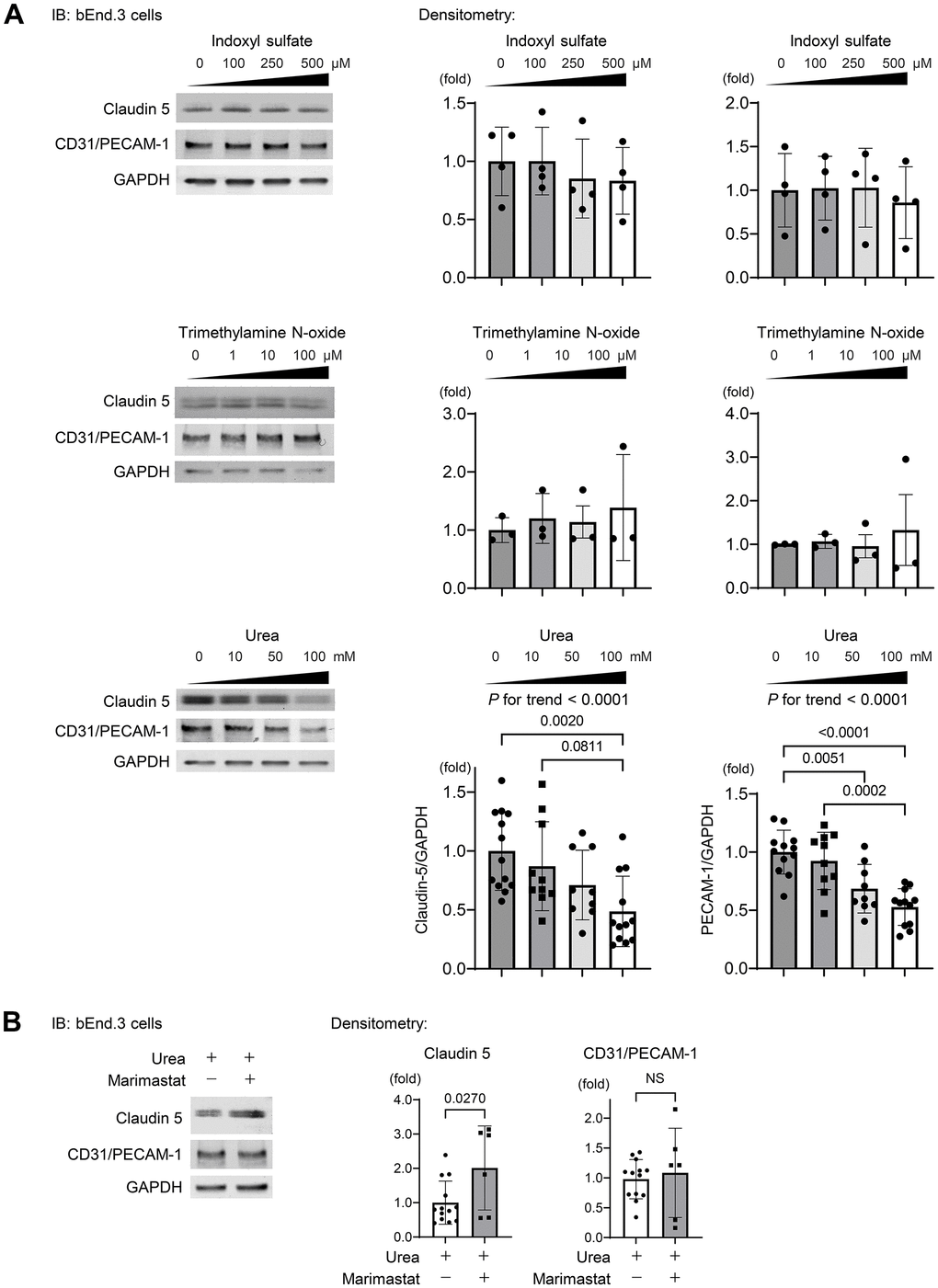 bEnd.3 cells were grown in 6-well plates at 50% confluency. The cells were treated with uremic toxins [urea (Sigma-Aldrich, St. Louis, MO, USA), indoxyl sulfate (Sigma-Aldrich), and Trimethylamine N-Oxide Dihydrate (TCI, Japan)] dissolved in phosphate buffered saline (PBS). For marimastat treatment, marimastat (BB-2516, Selleck) dissolved in 100% DMSO (dimethyl sulfoxide, Nacalai Tesque, Kyoto, Japan) to 10 mM was added to the well at 5 μM as the final concentration. As the vehicle, DMSO was treated as the final concentration 0.05% (v/v). Marimastat or DMSO was additionally treated every 24 h. After 36 h of a culture in DMEM containing uremic toxins with marimastat or DMSO, cells at 100% confluency were washed with PBS and dissolved in RIPA lysis buffer (Nacalai Tesque, Kyoto, Japan) and protease inhibitor cocktail (04080-11, Nacalai Tesque, Kyoto, Japan). The lysates were centrifuged at 12,000 rpm for 15 min, and the supernatant was diluted with 2× SDS sample buffer (Cosmo Bio USA CO., Carlsbad, CA, USA) and denatured at 60° C for 20 min.