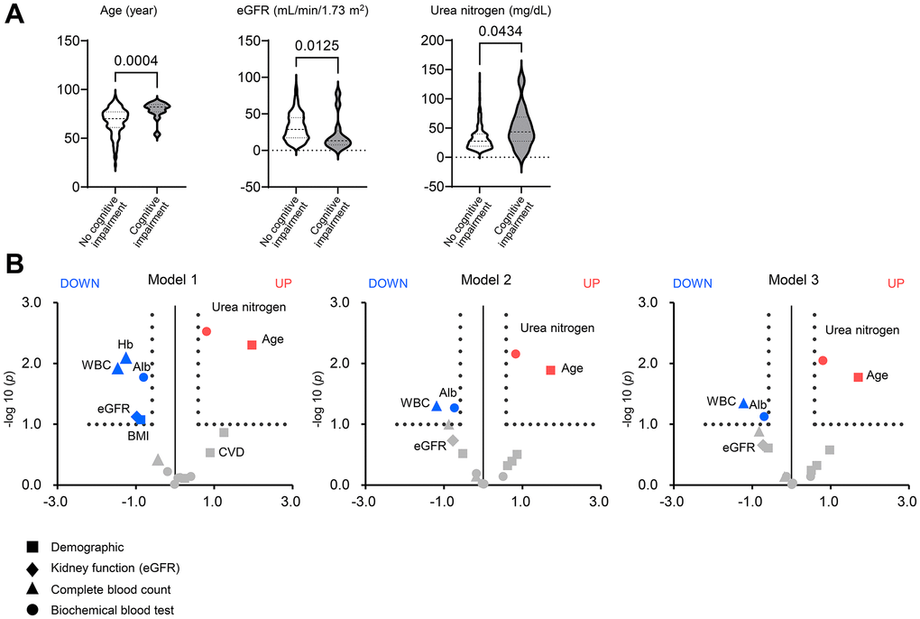 As shown in Figure 6A, patients with cognitive impairment had lower eGFR expression and higher urea nitrogen levels than those without cognitive impairment. Figure 6B illustrates the volcano plot graphs showing the associations of the demographic (square), kidney function (eGFR; diamond), complete blood count (triangle), and biochemical data (circle) with risk of cognitive impairment. In the univariate analysis (left; model 1), 1-standard deviation (S.D.) increases in eGFR (18.7 mL/min/1.73 m2), WBC (1,894/μL), hemoglobin (2.26 g/dL), serum albumin (0.64 g/dL), and BMI (4.13 kg per m2) were associated with a lower risk of cognitive impairment. In contrast, 1 S.D increases in urea nitrogen (19.6 mg/dL) and age (13.7 years) were associated with a greater risk of cognitive impairment. After adjusting for age and gender (middle; model 2), and additionally BMI, diabetes mellitus, and cardiovascular disease (right; model 3), the association of eGFR with cognitive impairment did not remain significant [odds ratio (OR), 0.61; 95% confidence intervals (95% CI), 0.27–1.35 in model 3].