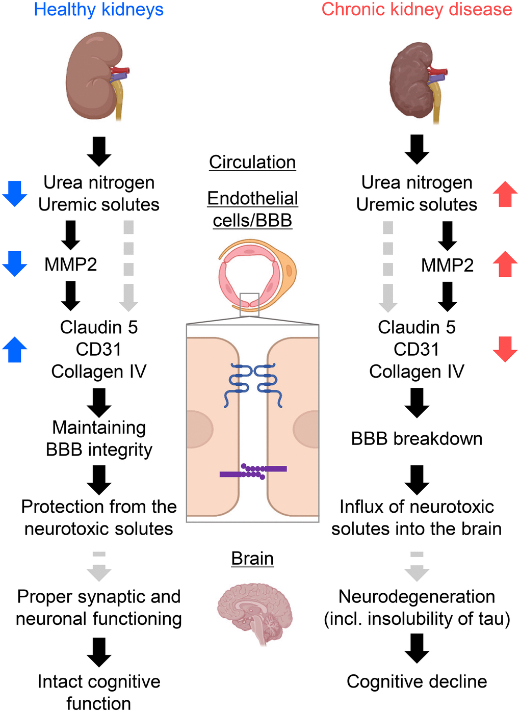 Our findings are summarized in Figure 7 and indicate a previously uncovered brain–kidney axis originating from BBB breakdown. CKD causes the accumulation of uremic solutes, particularly urea, which do not normally accumulate in healthy individuals. Urea induces active MMP2 in brain endothelial cells to degrade the claudin-5, PECAM-1, and collagen IV substrates, resulting in the influx of neurotoxic solutes due to BBB opening and worsening neurodegeneration. The accumulation of insoluble tau or RNA-binding proteins similar to the AD might result in cognitive impairment in CKD.