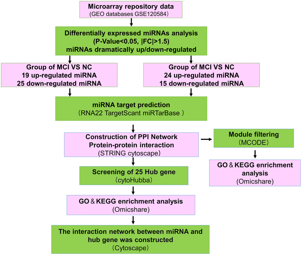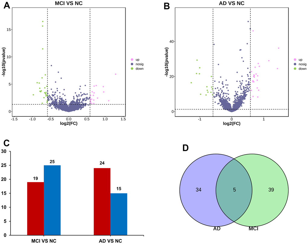 The data of NC, MCI, and AD in GSE120584 were analyzed differentially using GEO2R to obtain miRNAs differentially expressed in MCI and AD, and then the differential miRNAs were screened with p-value ≤ 0.05, Fold change ≥ 1.5 or Fold change ≤ -1.5 to obtain up-regulated miRNAs and down-regulated (Figure 1). The results of miRNAs in which there were 19 up-regulated miRNA and 25 down-regulated miRNA in MCI VS NC group (Figure 2A). There were 24 up-regulated miRNA expression and 15 down-regulated miRNA expression in AD VS NC group (Figure 2B); The columnar statistics of the different miRNAs were performed, red indicates upward adjustment and blue indicates downward adjustment (Figure 2C). Then the miRNAs that were co-differentially expressed in both MCI and AD were obtained by using Venn diagram analysis (Figure 2D), and a total of 5 differential miRNAs (hsa-miR-208a-5p, hsa-miR-125b-1-3p, hsa-miR-3194-3p, hsa-miR-4419a, hsa-miR-4652-5p) were obtained (Table 1).