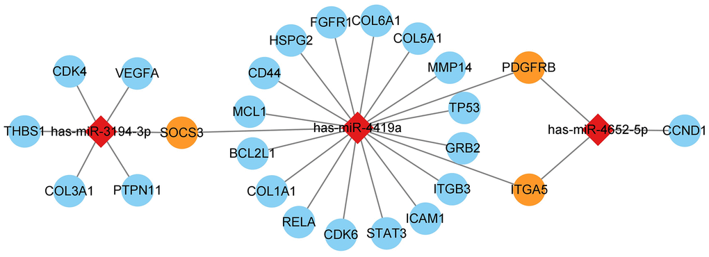 The miRNA was matched with the hub gene predicted before and was visualized by Cytoscape. Three miRNAs were matched by hub gene, namely hsa-miR-3194-3p, hsa-miR-4419a, and hsa-miR-4652-5p, all of them can regulate more than two hub genes (Figure 13).