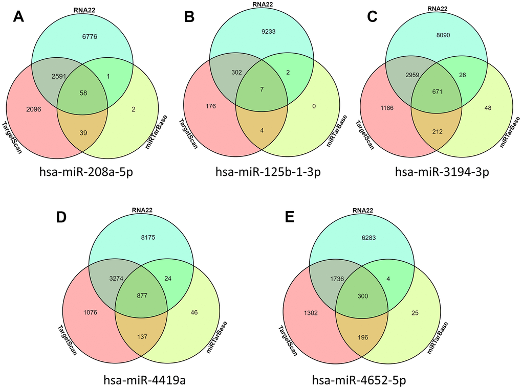 In order to explore how these intersection differences of miRNA play a role in the occurrence and development of AD, we used miRNA prediction tools miRTarBase, RNA22, and TarsCant to predict what target genes these miRNAs can control. Finally, according to the Venn diagram, the prediction target genes from three websites were interexchange. Intersection target genes predicted by the three sites simultaneously were obtained. Among them, hsa-miR-208a-5p predicted a total of 58 target genes (Figure 3A), hsa-miR-125b-1-3p predicted a total of 7 target genes (Figure 3B), hsa-miR-3194-3p a total of 671 target genes were predicted (Figure 3C), hsa-miR-4419a a total of 877 target genes were predicted (Figure 3D), hsa-miR-4652-5p a total of 300 target genes were predicted (Figure 3E).