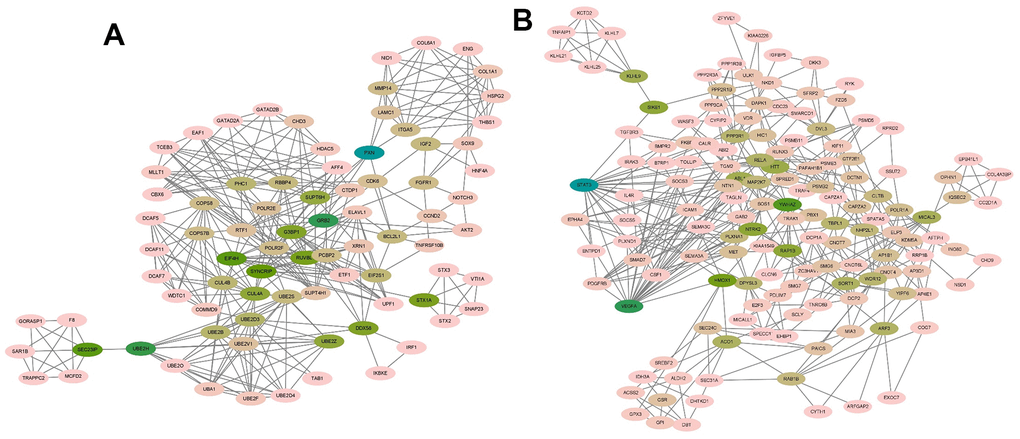 In order to explore how target genes play a role in the occurrence and development of AD disease, PPI network interaction was performed on all genes targeted by 5 miRNAs using STRING website (Figure 4A). The regulatory network of target gene interaction was obtained for subsequent analysis.