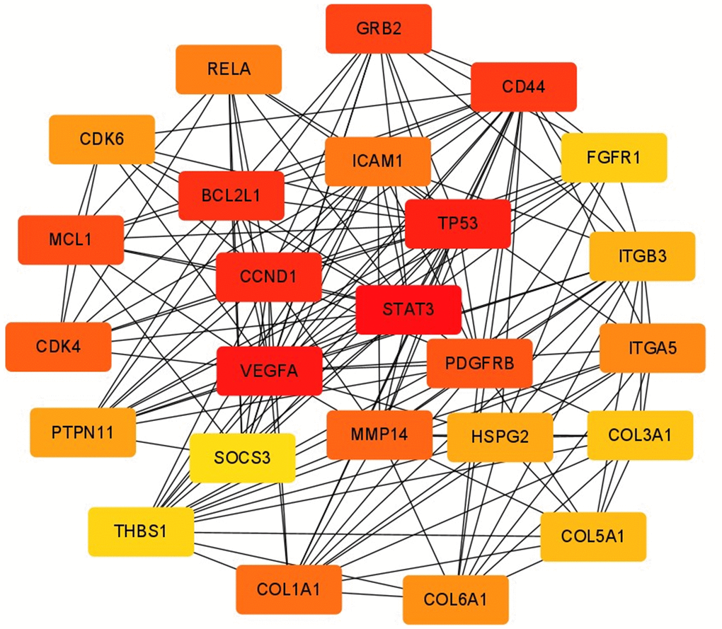 Among the previously predicted target genes, key regulatory genes were screened using Cytoscape’s plugin CytoHubba, and the top 25 hub genes were screened using the plugin’s maximum cluster centrality (MCC) algorithm. To calculate the clustering coefficient for each node in the network, we can use the following formula: Clustering Coefficient (C) = 2 x Number of edges between neighbors / (Degree of the node x (Degree of the node - 1)). To calculate the centrality index for each node in the network, we can use the following formula: Centrality Index (CI) = Degree of the node / (Number of nodes - 1). After calculating their clustering coefficients and centrality indices, hub genes were identified by filtering out the genes with high values in both measures. They are STAT3, VEGFA, TP53, CCND1, BCL2L1, CD44, GRB2, MCL1, PDGFRB, CDK4, MMP14, COL1A1, ICAM1, RELA, ITGA5, COL6A1, CDK6, PTPN11, HSPG2, ITGB3, COL5A1, COL3A1, FGFR1, THBS1, SOCS3, which play key regulatory roles in the target gene network (Figure 9). The score of each hub gene is shown in Table 4.
