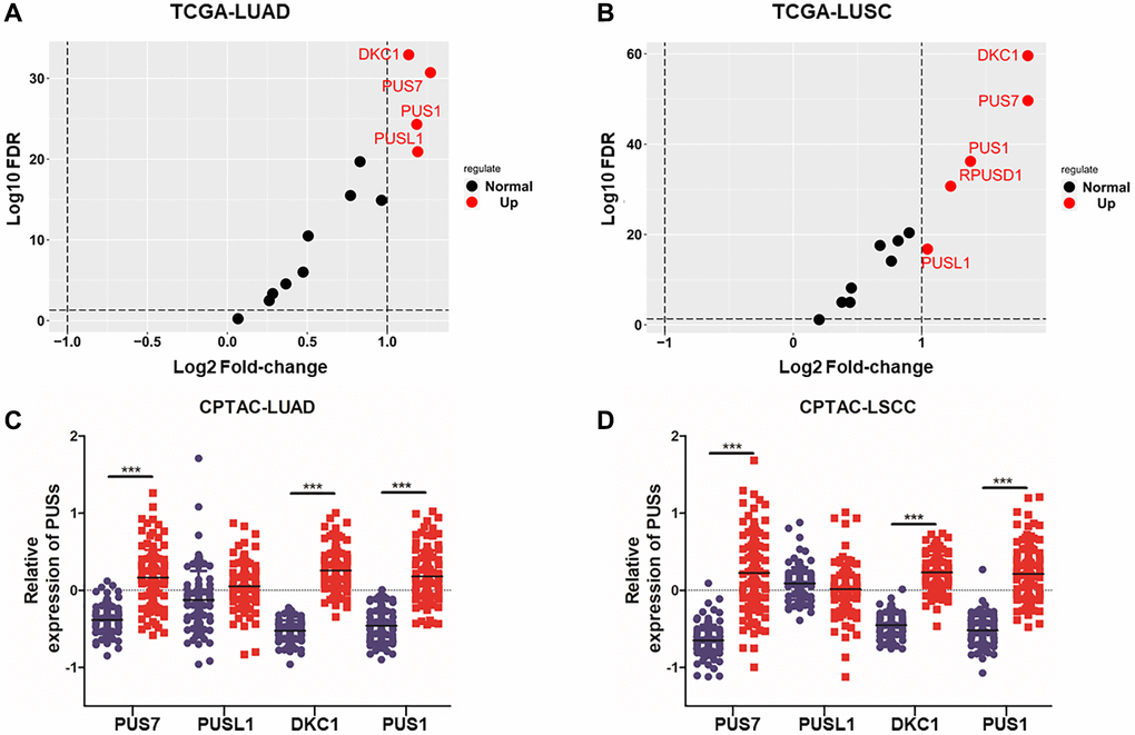 To investigate the expression of pseudouridine synthases in NSCLC, we analyzed 13 pseudouridine synthases expression between cancer tissue and normal tissue based on the TCGA database (TCGA-LUAD, TCGA-LUSC). The fold change of 13 pseudouridine synthases in LUAD and LUSC is shown in Figure 1A, 1B. 5 of 13 pseudouridine synthases are up-regulated in LUSC and 4 in LUAD. PUS7, PUSL1, PUS1, and DKC1 are up-regulated in both LUAD and LUSC which fold-change >2. Besides, the protein expression between cancer tissue and normal tissue of PUS7, PUSL1, PUS1, and DKC1 in LUAD and LSCC were shown in Figure 1C, 1D. PUS7, PUS1, and DKC1 are significantly up-regulated in cancer tissue at both mRNA and protein levels. Therefore, multi-omics analysis revealed that PUS7, PUS1, and DKC1 are upregulated in NSCLC.