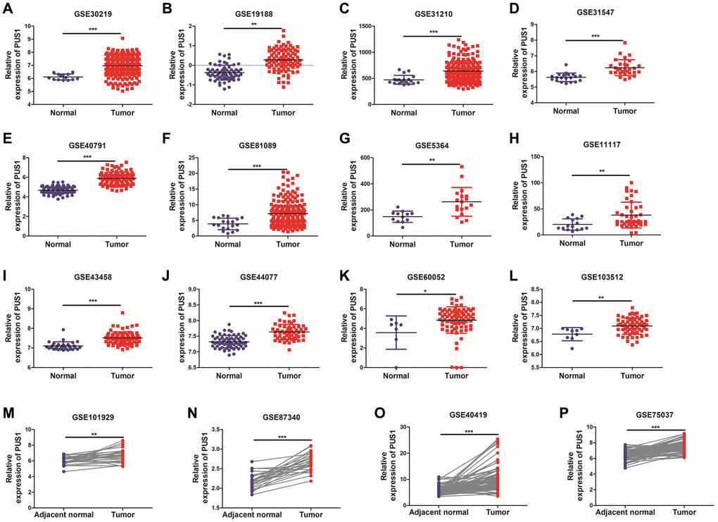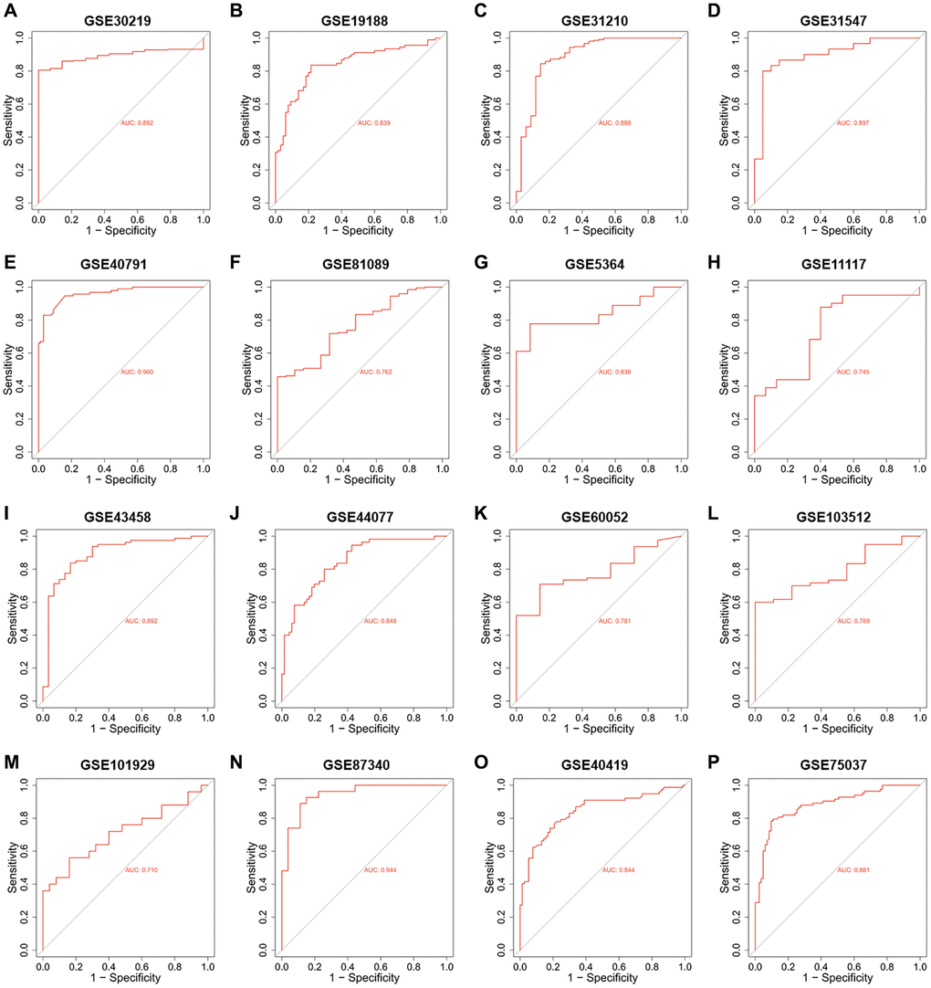 Since the roles of PUS7 and DKC1 in NSCLC have been investigated, in this study, we focused on the role of PUS1 in the occurrence and development of NSCLC. A large number of studies on the GEO dataset in NSCLC can comprehensively analyze the role of PUS1 in NSCLC. We further analyzed the expression of PUS1 in NSCLC from the GEO database. The mRNA expression of PUS1 between normal tissue and primary tissue in NSCLC was analyzed based on GEO datasets (GSE30219, GSE19188, GSE31210, GSE31547, GSE40791, GSE81089, GSE5364, GSE11117, GSE43458, GSE44077, GSE60052, and GSE103512). These datasets indicated that PUS1 was significantly up-regulated in tumor tissue (Figure 2A–2L). The expression of PUS1 in lung cancer and its matched adjacent normal tissues of patients from GSE101929, GSE87340, GSE40419, and GSE75037 confirmed the results (Figure 2M–2P). The ROC analysis showed that the AUC of 16 GEO datasets ranges from 0.7–0.89 (Figure 3A–3P). In summary, the up-regulation of PUS1 expression in NSCLC has been confirmed by multiple GEO datasets.