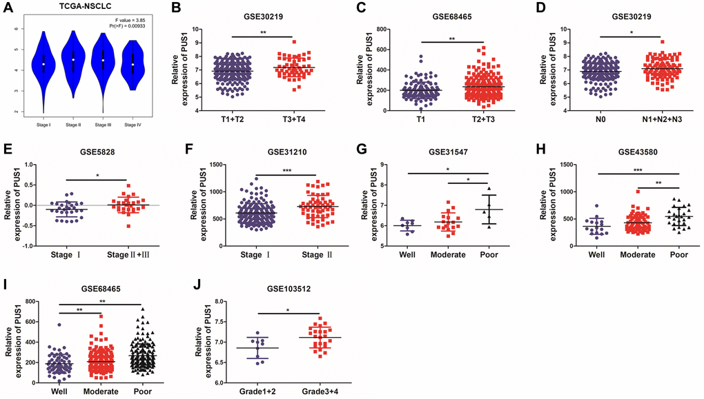 In order to determine the correlation between PUS1 and development in NSCLC, the relationship between PUS1 and tumor stage or differentiation was analyzed through multiple GEO datasets. Based on the TCGA-LUAD and LUSC data, the expression of PUS1 showed a significant difference among different main pathological stages (Figure 4A and Supplementary Figure 1A, 1B). Similarly, PUS1 expression was also significantly different among various T stage, N stage, and clinical stage based on GEO datasets. This result indicated that high expression of PUS1 correlates with larger tumor size (Figure 4B, 4C), higher lymph node metastasis (Figure 4D), and worse clinical stage (Figure 4E, 4F). In addition, tumor differentiation is closely related to the malignancy of the tumor. Poor differentiation predicts a worse prognosis. The expression of PUS1 was significantly up-regulated in patients with poor differentiation (Figure 4G–4J). In conclusion, high expression of PUS1 is correlated with the malignancy of NSCLC and may promote tumor development.